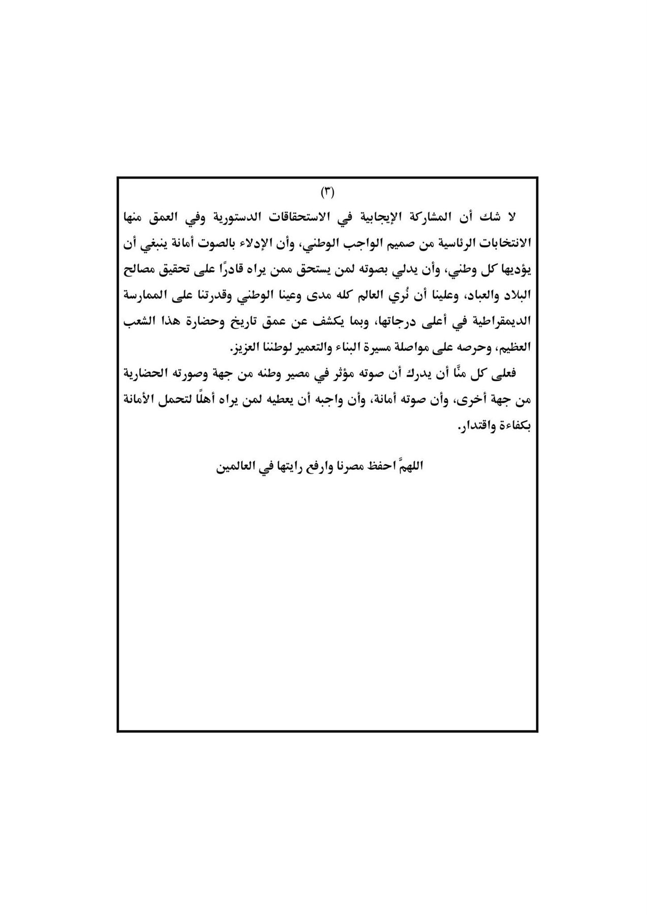 لا شك أن المشاركة الإيجابية في الاستحقاقات الدستورية وفي العمق منها الانتخابات الرئاسية من صميم الواجب الوطني، وأن الإدلاء بالصوت أمانة ينبغي أن يؤديها كل وطني، وأن يدلي بصوته لمن يستحق ممن يراه قادرًا على تحقيق مصالح البلاد والعباد، وعلينا أن نُري العالم كله مدى وعينا الوطني وقدرتنا على الممارسة الديمقراطية في أعلى درجاتها، وبما يكشف عن عمق تاريخ وحضارة هذا الشعب العظيم، وحرصه على مواصلة مسيرة البناء والتعمير لوطننا العزيز.
