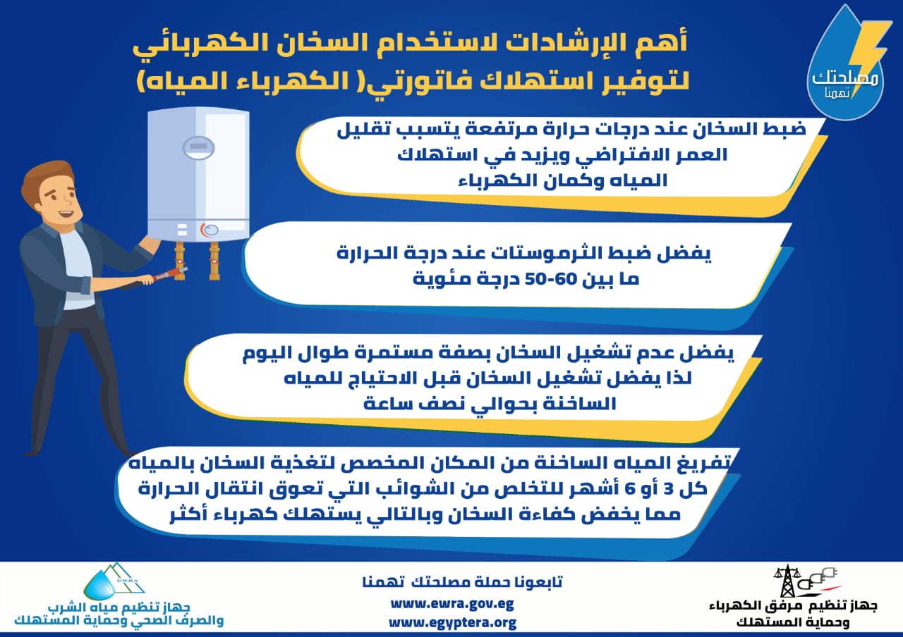 كما قدم جهاز تنظيم مرفق الكهرباء وحماية المستهلك ايضا عده نصائح لاستخدام السخان الكهربائي التي تساعد في التحكم في استهلاك الكهرباء:
