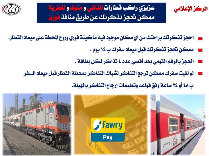 أعلنت هيئة السكة الحديد بدء حجز تذاكر القطارات من خلال منافذ فوري لقطارات المناشي ومنوف والمطرية،مع إمكانية حجز التذاكر قبل معاد السفر بـ14 يوم من خلال الرقم القومي بحد أقصى 4 تذاكر لكل بطاقة وفي حالة طلب رغبة الراكب في إلغاء الحجز يتم استرجاع قيمة التذكرة من خلال شباك التذاكر بمحطة القطار قبل 48 أو24 ساعة من قيام الرحلة.