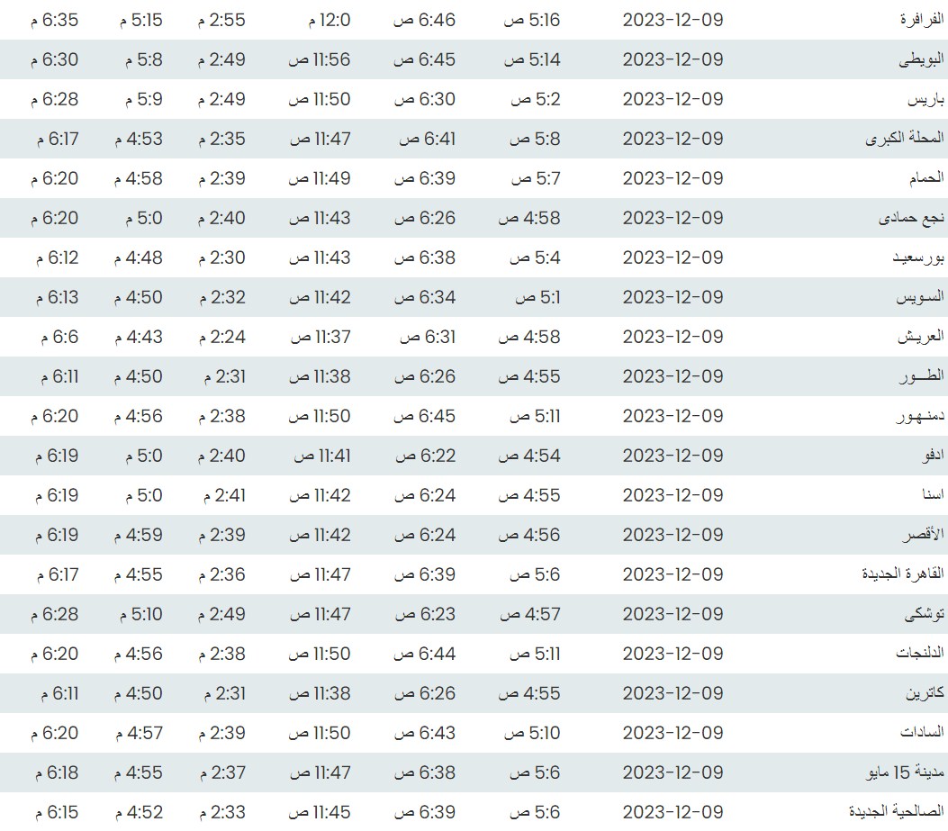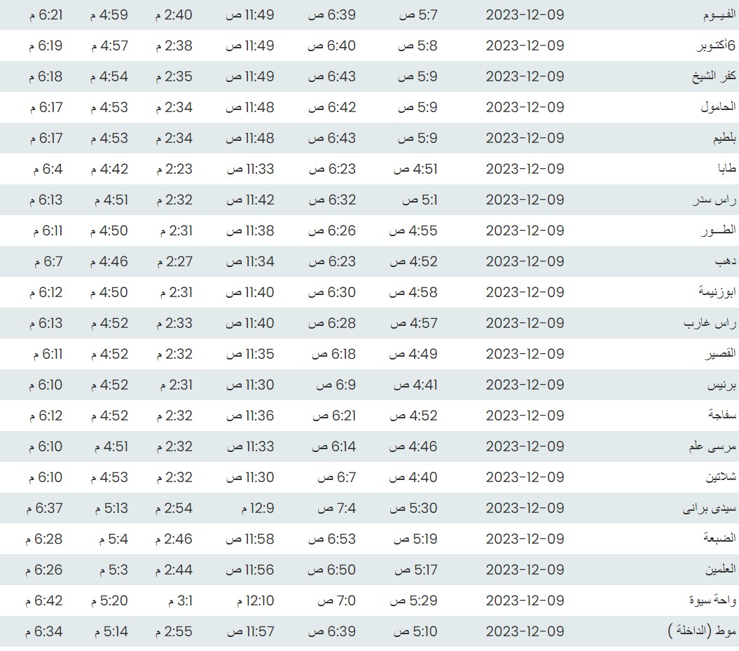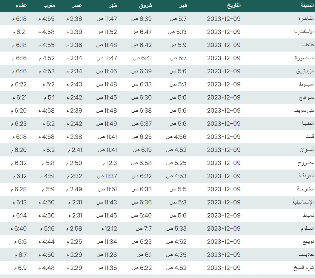 مواقيت الصلاة اليوم وفقًا للتوقيت المحلي لمدينتي القاهرة والإسكندرية وكذلك،مواقيت الصلاة، لعدد من مدن ومحافظات الجمهورية من واقع بيانات الهيئة العامة للمساحة