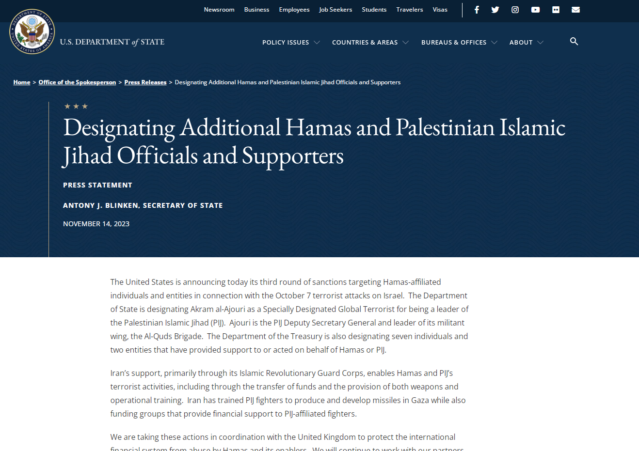 وفي نفس التارخ 14 نوفمبر الماضي، إدراجت الولايات المتحدة الأمريكية مسؤولين ومناصرين لحركة المقاومة الفلسطينية حماس وحركة الجهاد الإسلامي في المقاومة الفلسطينة على لائحة العقوبات، وجاء في بيان وزير الخارجية الأمريكي أنتوني بلينكن "تعلن الولايات المتحدة اليوم عن الجولة الثالثة من العقوبات التي تستهدف أفراد وكيانات مرتبطين بحركة حماس، وذلك لصلتهم بهجمات 7 أكتوبر على إسرائيل."