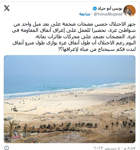 وثَّق مقطع فيديو وصور تداوله رواد مواقع التواصل الاجتماعي على نطاق واسع لحظة مد قوات جيش الاحتلال الإسرائيلي، أنابيب المياه من البحر، في ما يبدو أنه محاولة لإغراق أنفاق حركة حماس في قطاع غزة.