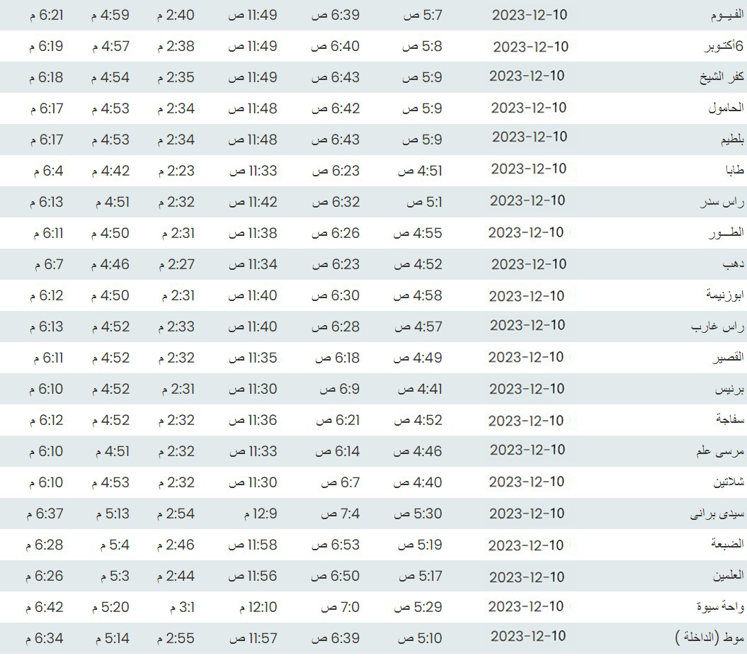 مواقيت الصلاة اليوم وفقًا للتوقيت المحلي لمدينتي القاهرة والإسكندرية وكذلك، مواقيت الصلاة، لعدد من مدن ومحافظات الجمهورية من واقع بيانات الهيئة العامة للمساحة
