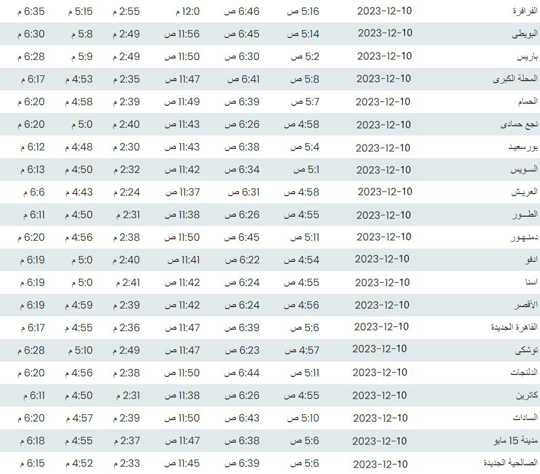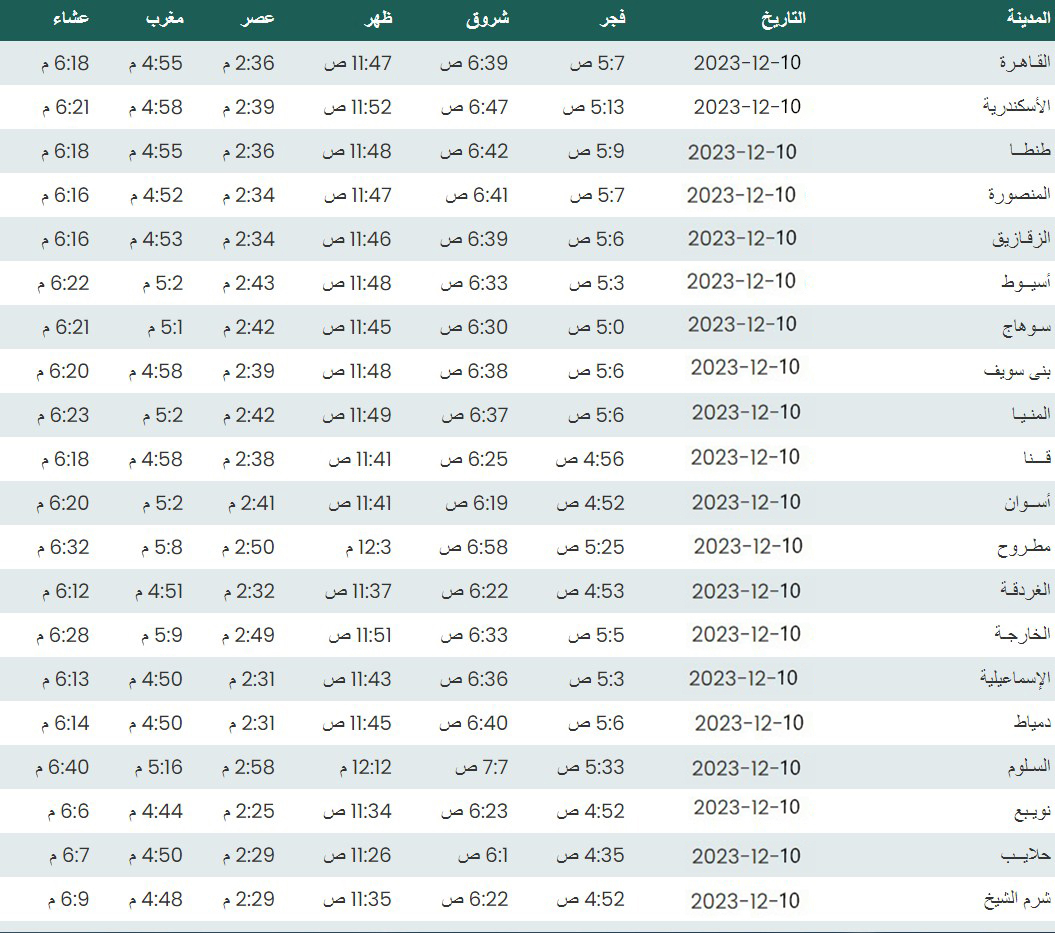 مواقيت الصلاة اليوم وفقًا للتوقيت المحلي لمدينتي القاهرة والإسكندرية وكذلك، مواقيت الصلاة، لعدد من مدن ومحافظات الجمهورية من واقع بيانات الهيئة العامة للمساحة