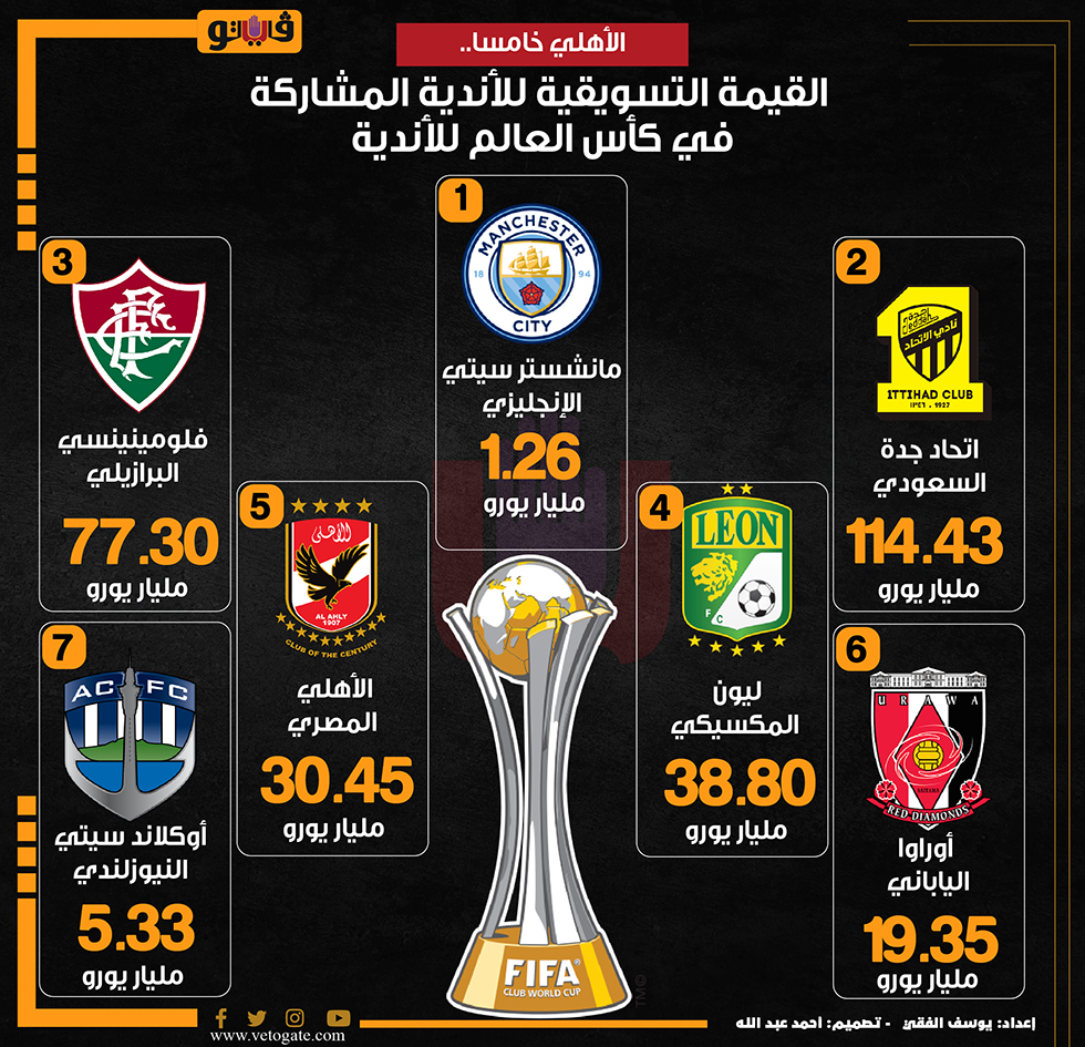 الأهلي خامسا.. القيمة التسويقية للأندية المشاركة في كأس العالم للأندية (إنفوجراف)