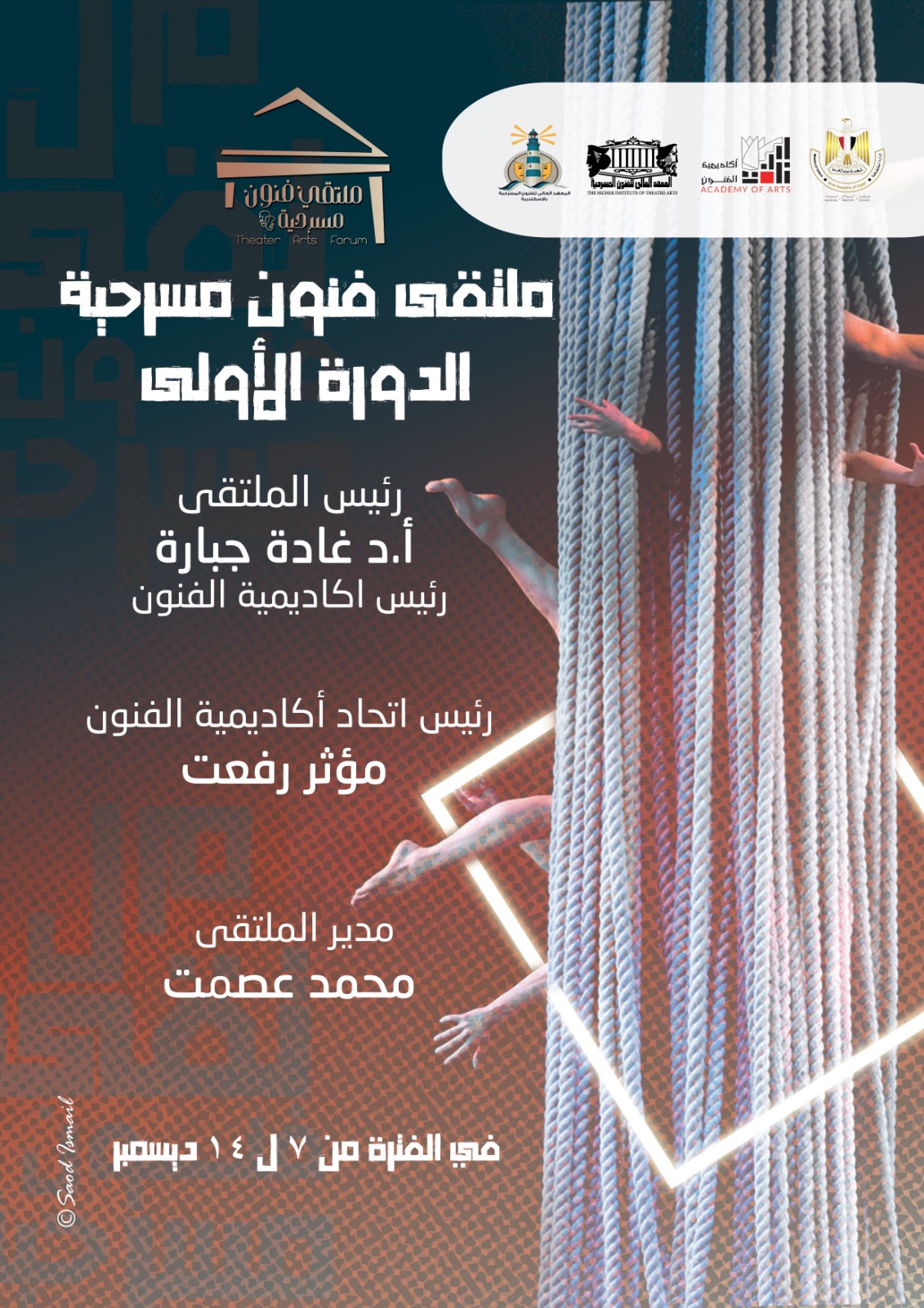 ينطلق مساء اليوم الخميس الموافق 7 ديسمبر الجاري، ملتقى فنون مسرحية في دورته الأولى بمشاركة طلاب المعهد العالى للفنون المسرحية بفرعيه بالقاهرة والإسكندرية، وذلك على خشبة مسرح علي فهمي بالمعهد العالي للفنون المسرحية بأكاديمية الفنون بالهرم.