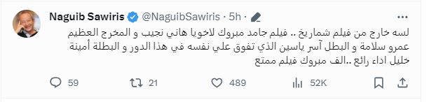 وقال “ساويرس” عبر حسابه الرسمي بمنصة “إكس” تويتر سابق: "لسه خارج من فيلم شماريخ.. فيلم جامد مبروك لأخويا هاني نجيب والمخرج العظيم عمرو سلامة والبطل آسر ياسين الذي تفوق علي نفسه في هذا الدور والبطلة أمينة خليل أداء رائع.. ألف مبروك فيلم ممتع".
