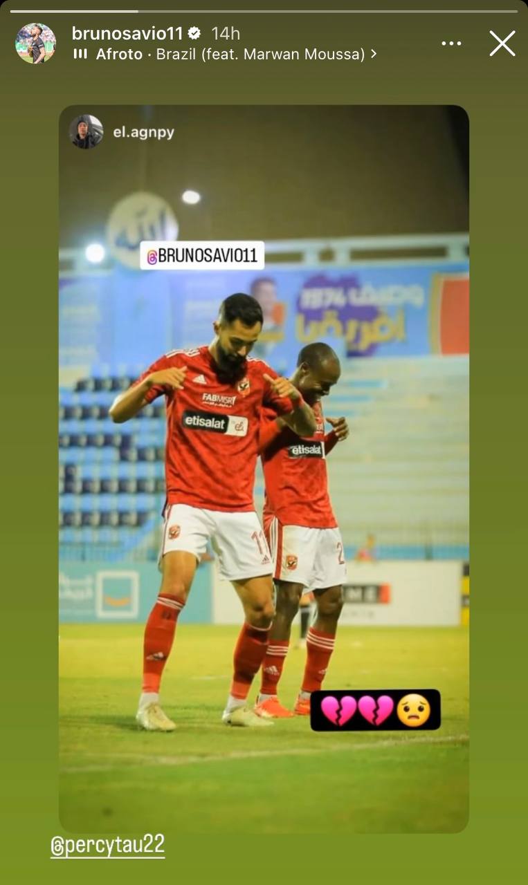 نشر البرازيلي برونو سافيو لاعب الأهلي السابق صورة تجمعه بلاعب المارد الأحمر الجنوب أفريقي بيرسي تاو، أثناء احتفالهم بأحد الأهداف في الدوري أثناء تواجده مع الفريق الأحمر الموسم الماضي.