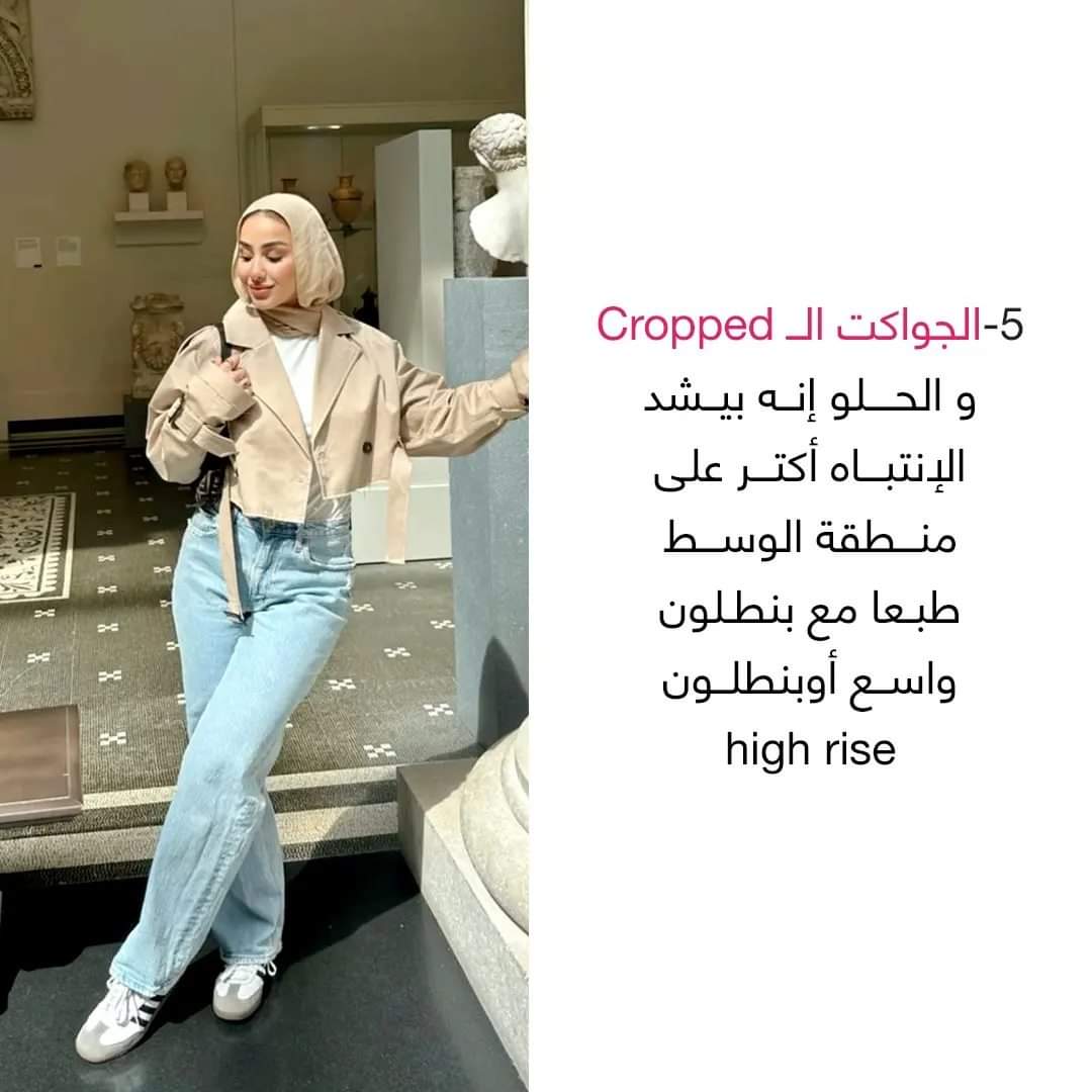 الجواكت الكروبت التى تكون على الوسط وعليها بنطال واسع أو هاى ويست وهى من أحدث صيحات الموضة هذا الموسم، وهى تمنح صاحبتها شكلا مميزا وجذابا.