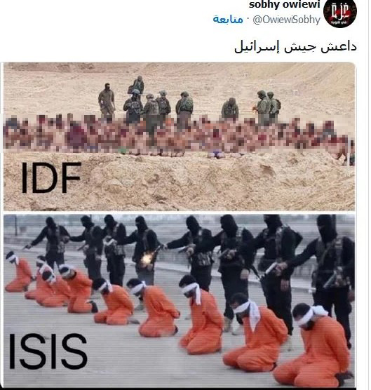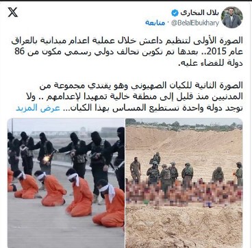 وكتب أحدهم معلقا: "داعش جيش إسرائيل"، وأضاف آخر: "الصورة الأولى لتنظيم داعش خلال عملية إعدام ميدانية بالعراق عام 2015.. بعدها تم تكوين تحالف دولي رسمي مكون من 86 دولة للقضاء عليه..الصورة الثانية للكيان الصهيوني وهو يقتدي مجموعة من المدنيين إلى منطقة خالية تمهيدا لإعدامهم.. ولا توجد دولة واحدة تستطيع المساس بهذا الكيان أو إطلاق رصاصة واحدة عليه. نحن نعيش في أرذل الحقب التاريخية!".