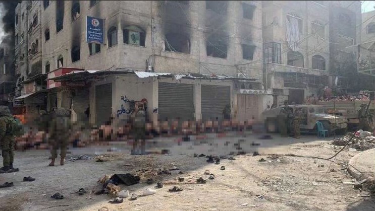 في مقاطع الفيديو والصور التي بثها التلفزيون الإسرائيلي مساء الخميس في وقت الذروة، وانتشرت على نطاق واسع على شبكات التواصل الاجتماعي، يظهر رجال مصطفون جاثين على ركبهم ورؤوسهم إلى الأسفل، وجميعهم يرتدون ملابس داخلية في وسط المدينة.