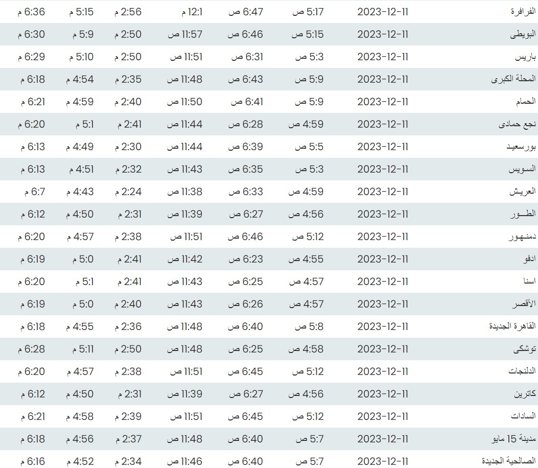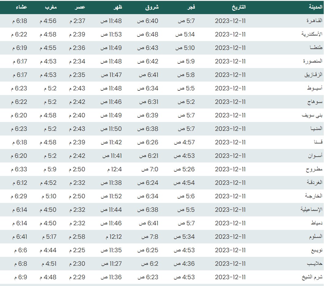 مواقيت الصلاة اليوم الإثنين 11 - 12 - 2023 في القاهرة والمحافظات