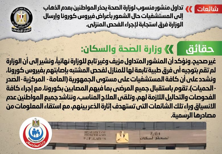 وتواصل المركز الإعلامي لمجلس الوزراء مع وزارة الصحة والسكان، والتي نفت تلك الأنباء، مُؤكدةً أنه لا صحة للمنشور المنسوب لوزارة الصحة الذي يحذر المواطنين بعدم الذهاب إلى المستشفيات حال الشعور بأعراض فيروس كورونا أو إرسال الوزارة فرق استجابة لإجراء الفحص المنزلي، وأن المنشور المتداول مزيف وغير تابع للوزارة نهائيًا.