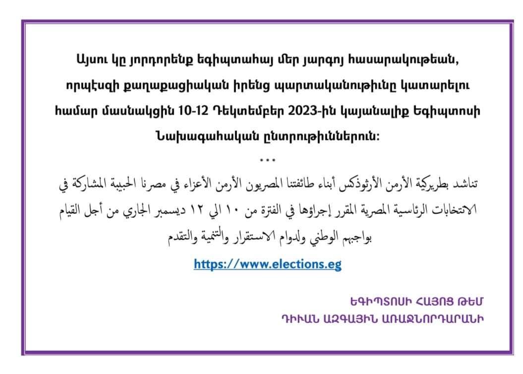 ناشدت بطريركية الأرمن الأرثوذكس فى مصر المصريين الأرمن ضرورة المشاركة في انتخابات الرئاسة المصرية.