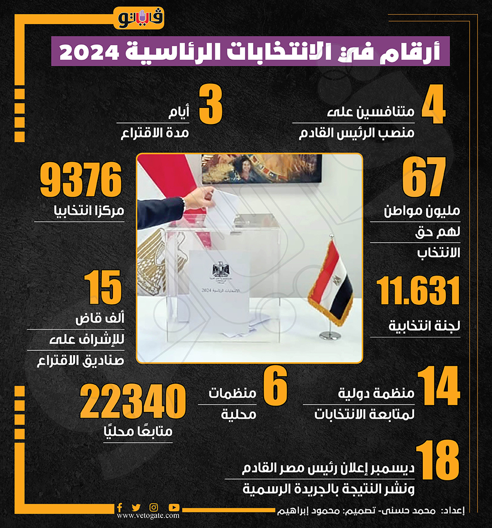 أرقام في الانتخابات الرئاسية 2024 (انفوجراف) السبت 09/ديسمبر/2023 - 01:29 م 12/9/2023 1:29:54 PM الانتخابات الرئاسية 2024، فيتو محمد حسنى شارك طباعة 18 حجم الخط شارك طباعة