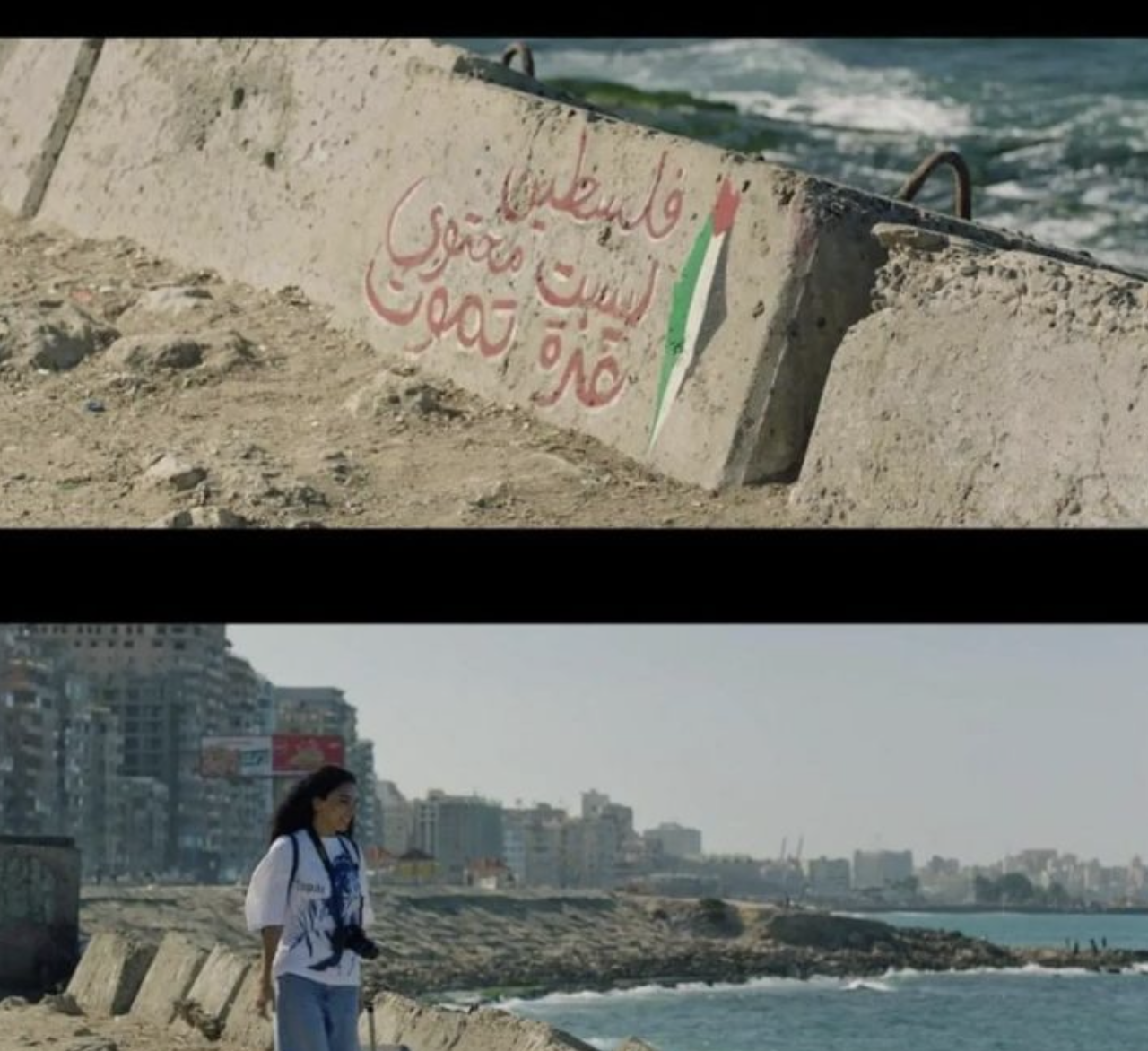 ونشرت سلمى صورة من المسلسل وهي تصور في الإسكندرية وتظهر صخرة مكتوب عليها “ فلسطين ليست محتوى.. غزة تموت”، ومرسوم إلى جانب هذا الكلام علم فلسطين.