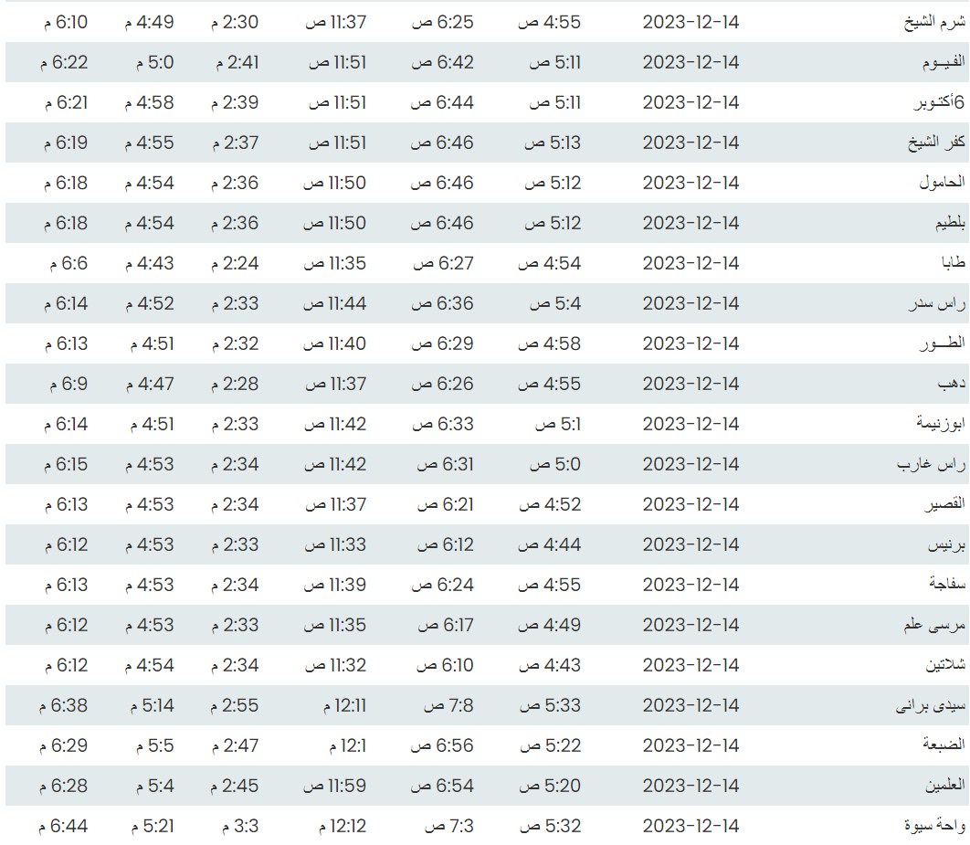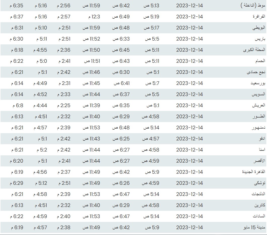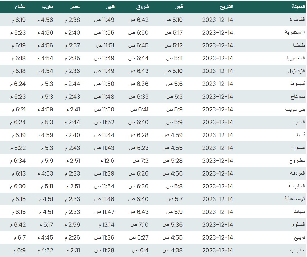 مواقيت الصلاة اليوم وفقًا للتوقيت المحلي لمدينتي القاهرة والإسكندرية وكذلك،مواقيت الصلاة، لعدد من مدن ومحافظات الجمهورية من واقع بيانات الهيئة العامة للمساحة