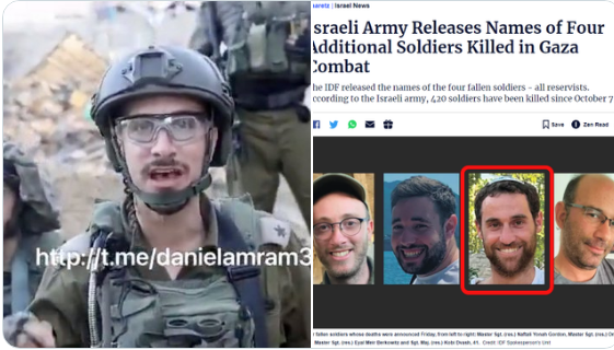 وعلق معاذ قائلًا: "تم التاكيد من صحيفه هأرتس العبرية عن مقىًل جندي الاحتلال، اسمه ايال مائير بيركويتز ورتبته رقيب، قتل هو ومعه 3 اشخاص قبل يومين تاريخ 7، وحسب الخبر ايضًا انه قىًل 420 جندي من تاريخ 7 اكتوبر لليوم… طبعًا الخبر ماقال انه نفسه المفجر بس مستخدمين الانترنت تعرفو على شكله"