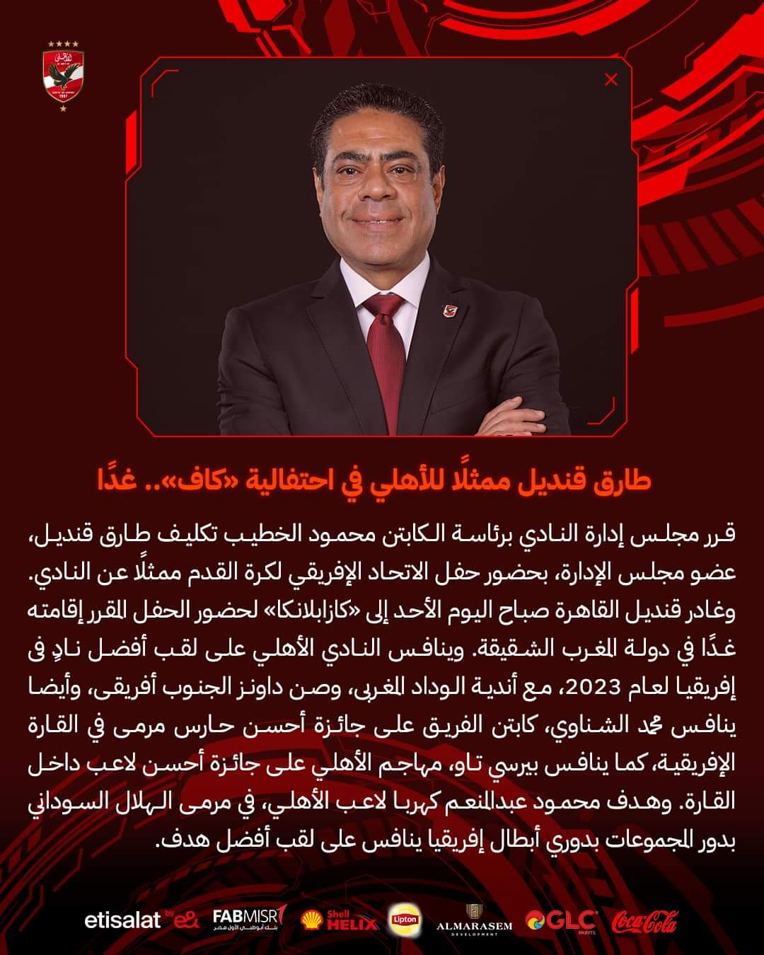 كلف مجلس إدارة النادي الأهلي برئاسة محمود الخطيب طارق قنديل عضو مجلس الإدارة بتمثيل النادي غدا في احتفالية كاف التي ستقام في المغرب حيث ينافس الأهلي على لقب أفضل ناد في القارة الإفريقية.