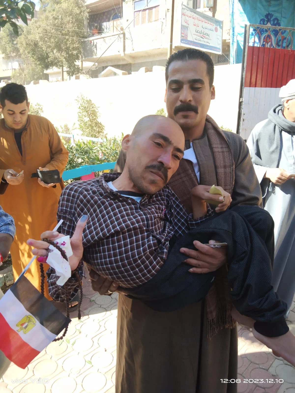 محمولا على الأيدي، مواطن من ذوى الاحتياجات يدلي بصوته الانتخابي فى لجنة بأسيوط