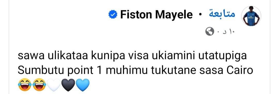 وقال ماييلي عبر حسابه الرسمي بموقع التواصل الاجتماعي إنستجرام مخاطبا مسئولي صن داونز: "رفضتم إعطائي تأشيرة الدخول لجنوب إفريقيا لأنكم اعتقدتم بذلك أنكم ستهزموننا، ولكن حصلنا على نقطة مهمة في عقر داركم، لنتقابل في القاهرة".