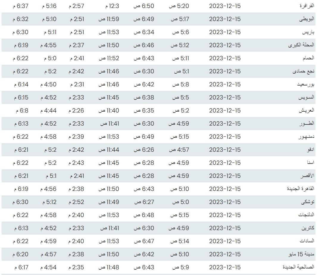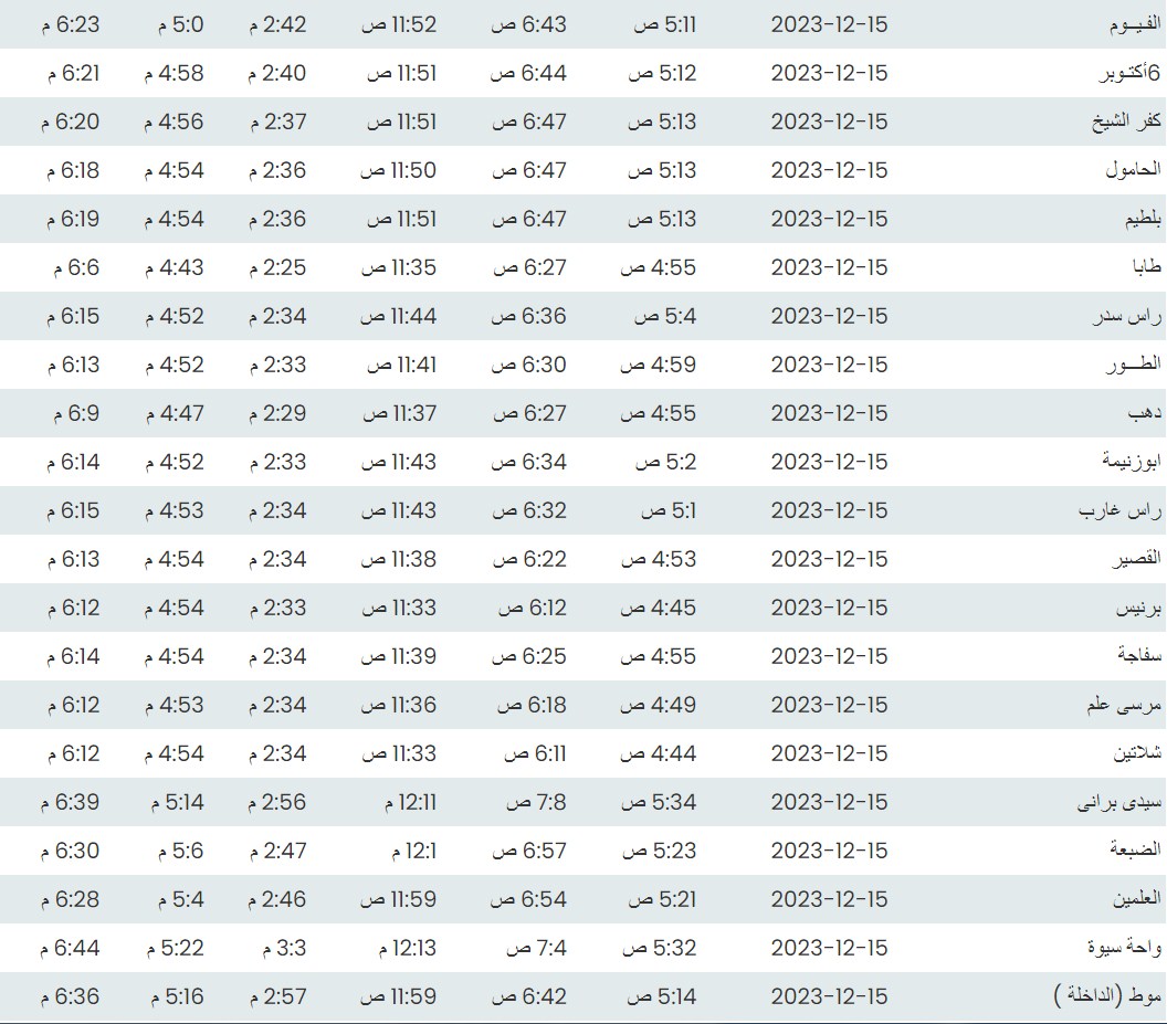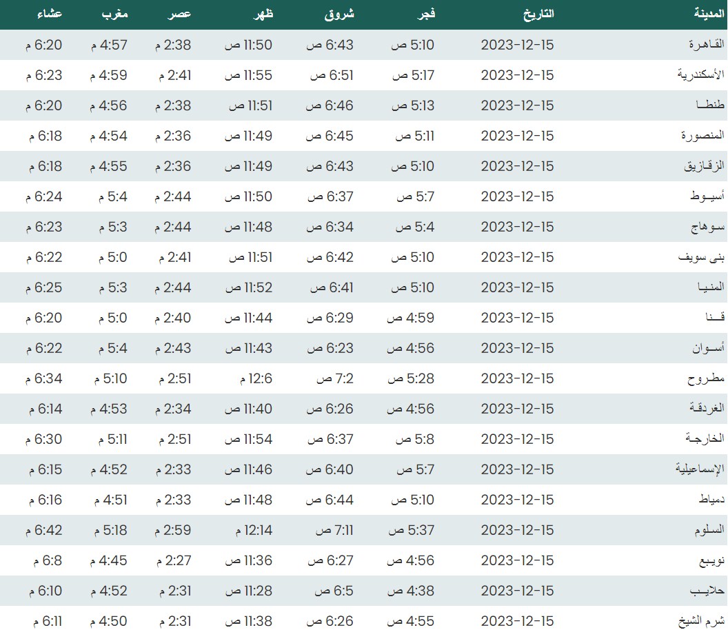 مواقيت الصلاة اليوم وفقًا للتوقيت المحلي لمدينتي القاهرة والإسكندرية وكذلك،مواقيت الصلاة، لعدد من مدن ومحافظات الجمهورية من واقع بيانات الهيئة العامة للمساحة