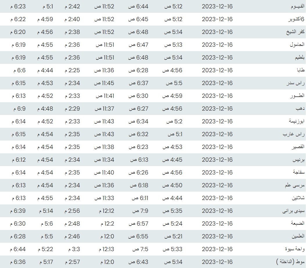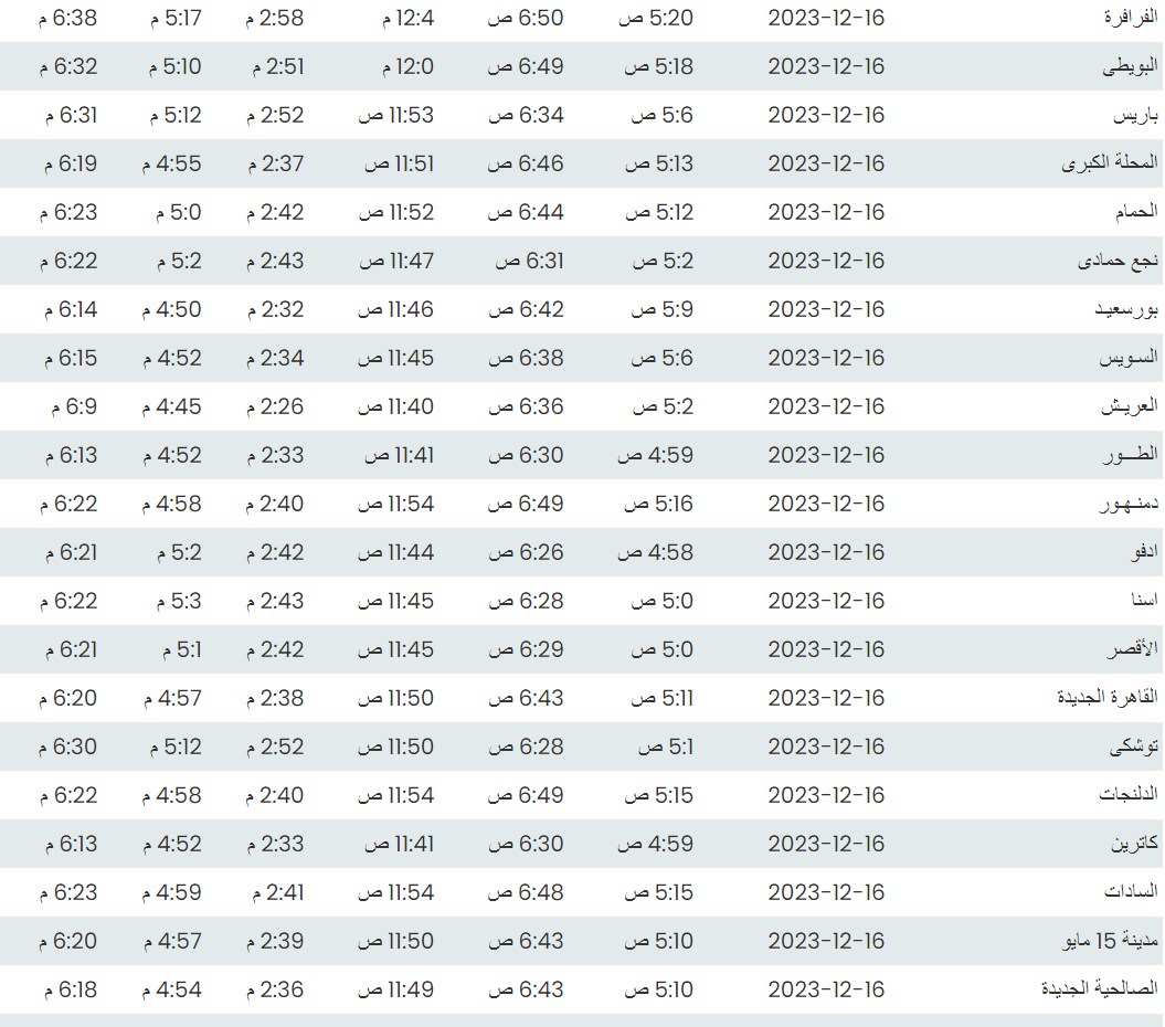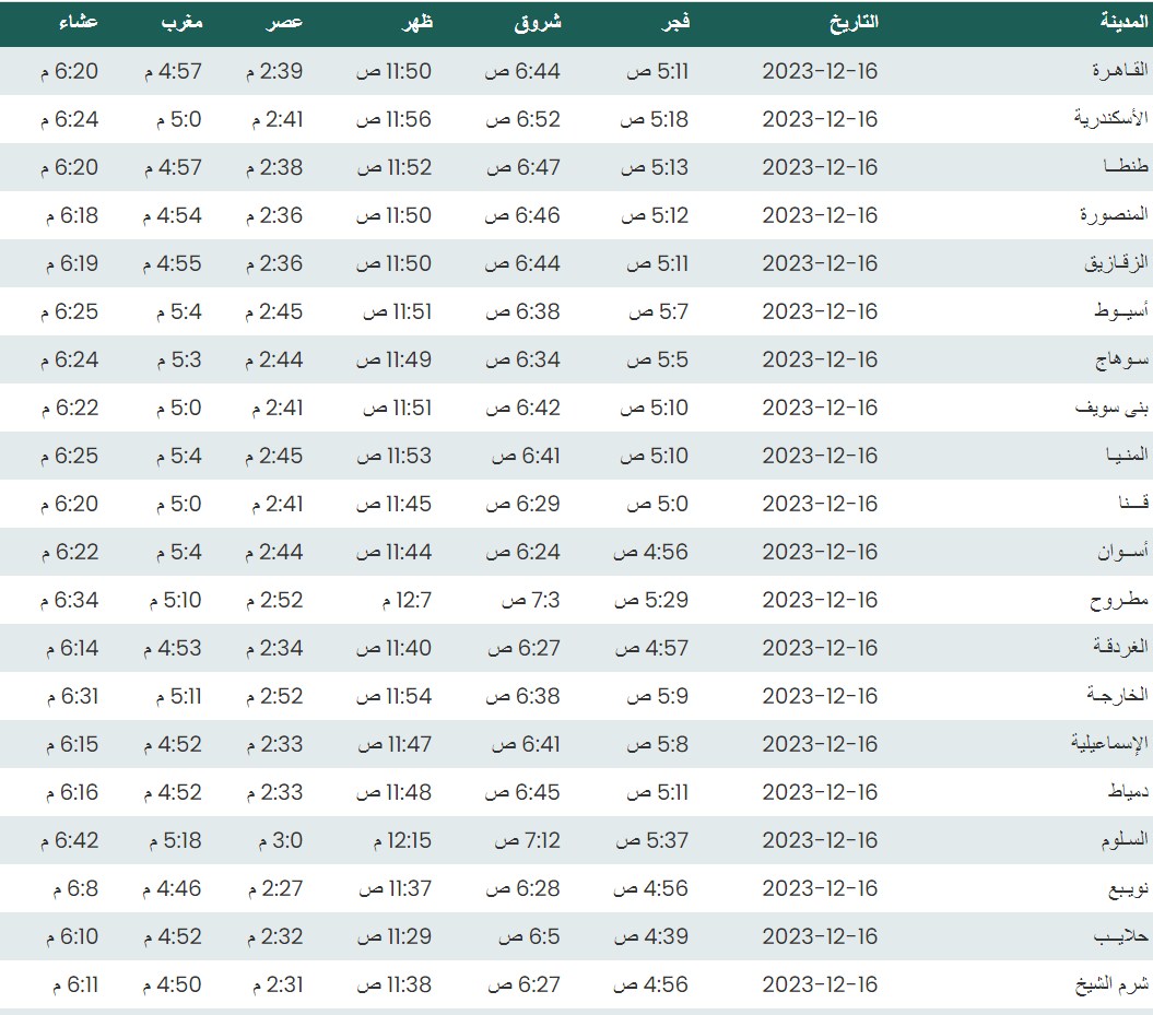 مواقيت الصلاة اليوم وفقًا للتوقيت المحلي لمدينتي القاهرة والإسكندرية وكذلك،مواقيت الصلاة، لعدد من مدن ومحافظات الجمهورية من واقع بيانات الهيئة العامة للمساحة