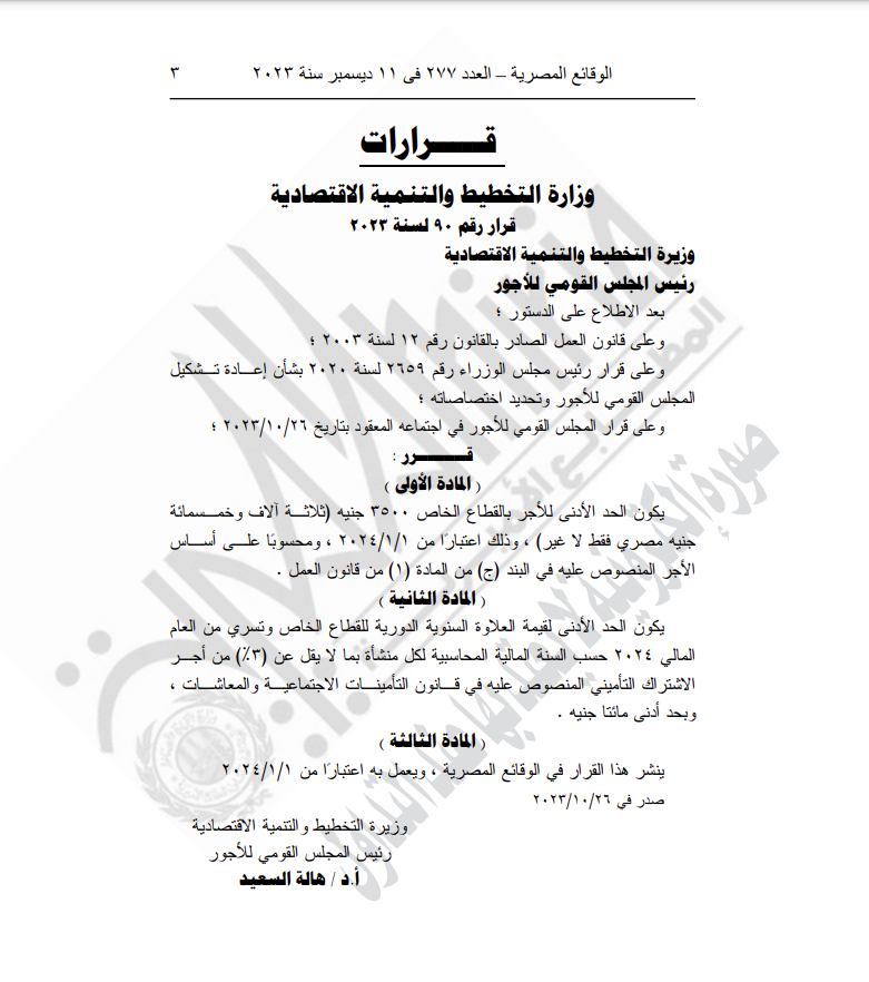 نشرت جريدة الوقائع المصرية في عددها رقم 277، الصادر في 11 ديسمبر 2023، قرار وزارة التخطيط والتنمية الاقتصادية رقم 90 لسنة 2023، بشأن إقرار الحد الأدنى للأجر بالقطاع الخاص ٣٥٠٠ جنيه، اعتبارًا من أول يناير 2024.