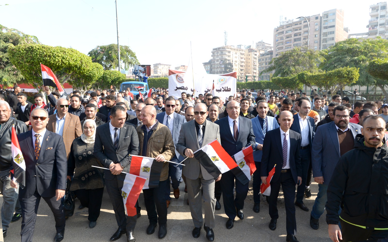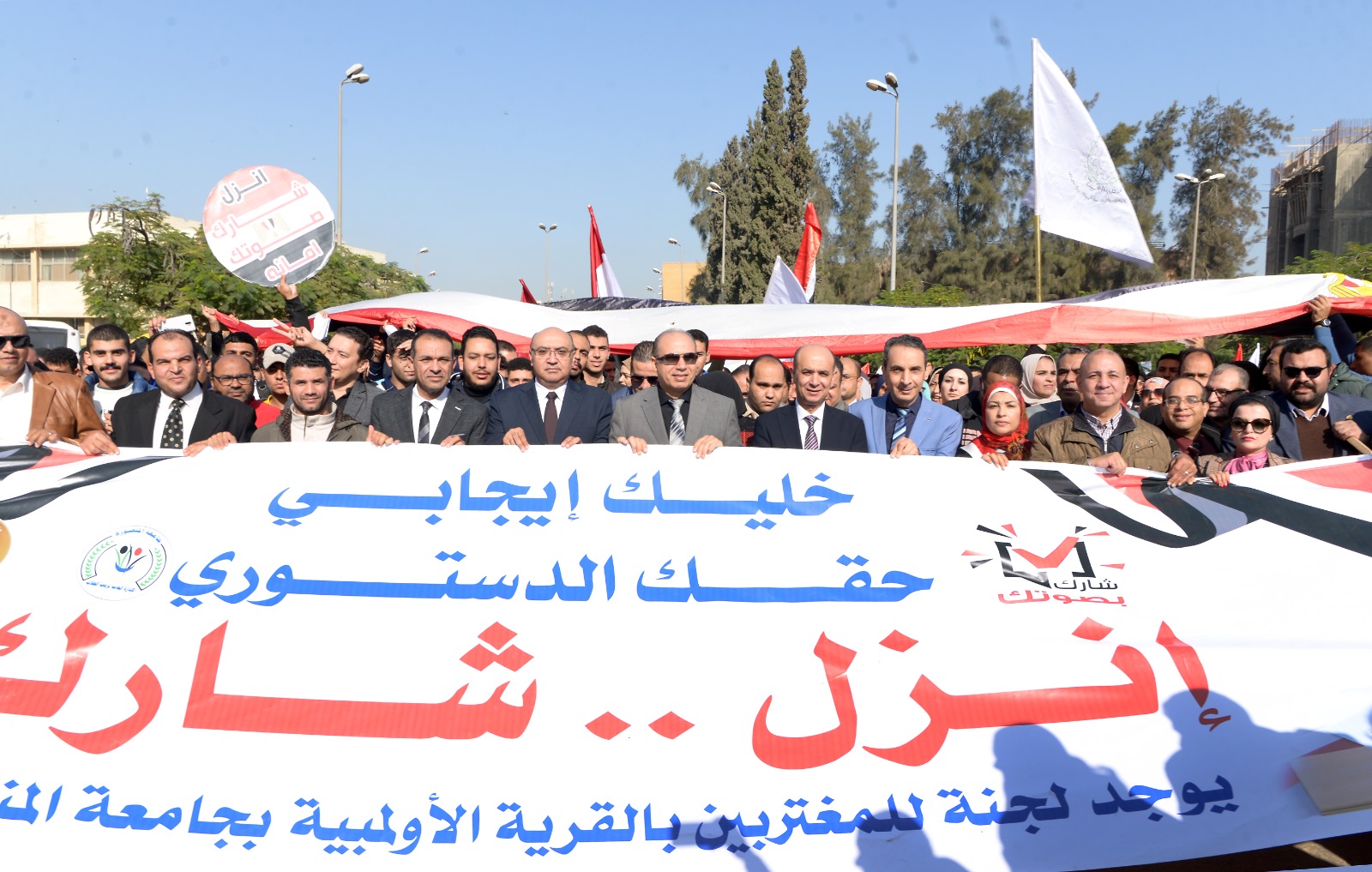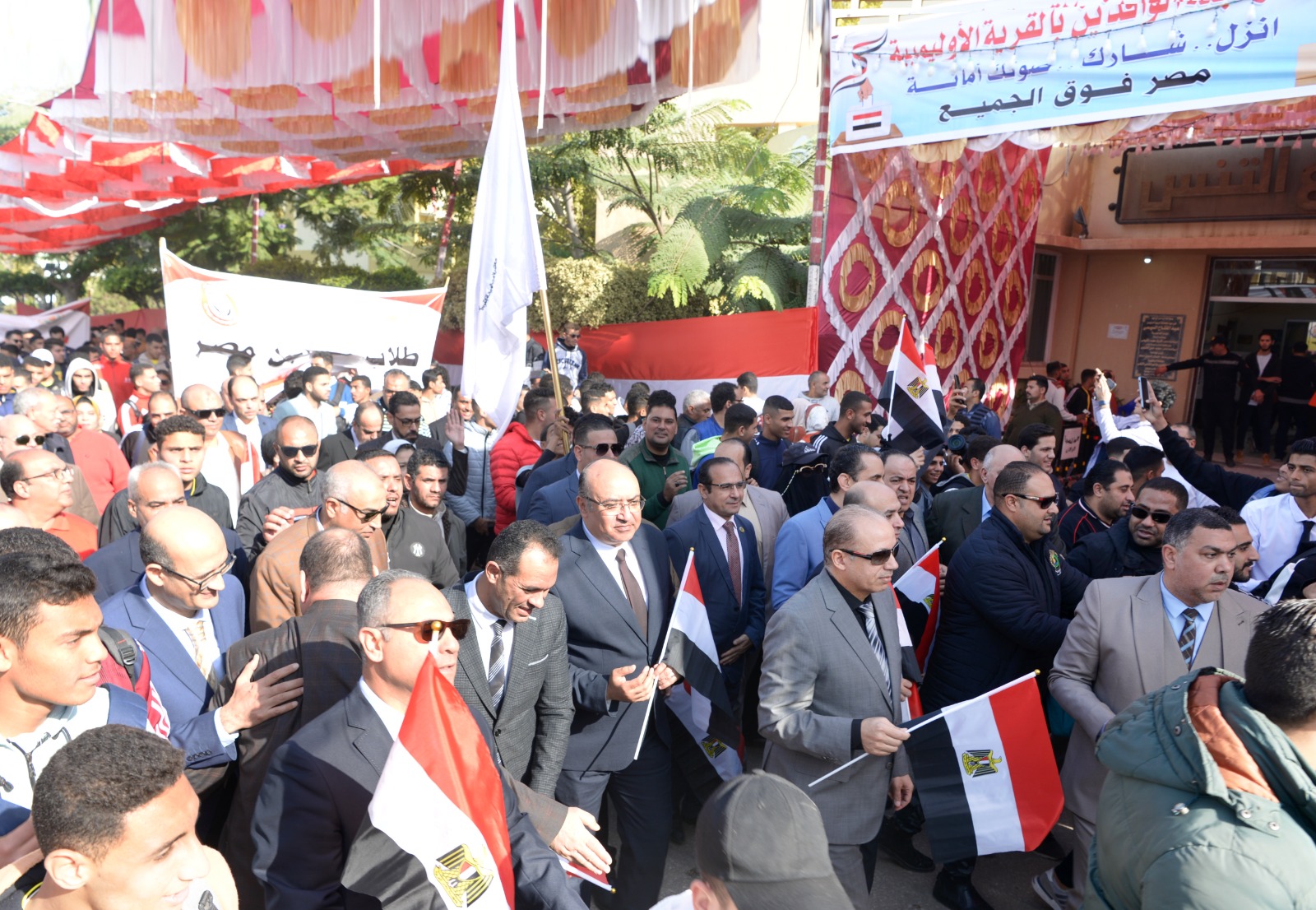 بدأت المسيرة من داخل الحرم الجامعي وحتى مقر لجنة المغتربين بالقرية الأولمبية للحث على المشاركة في العملية الانتخابية.