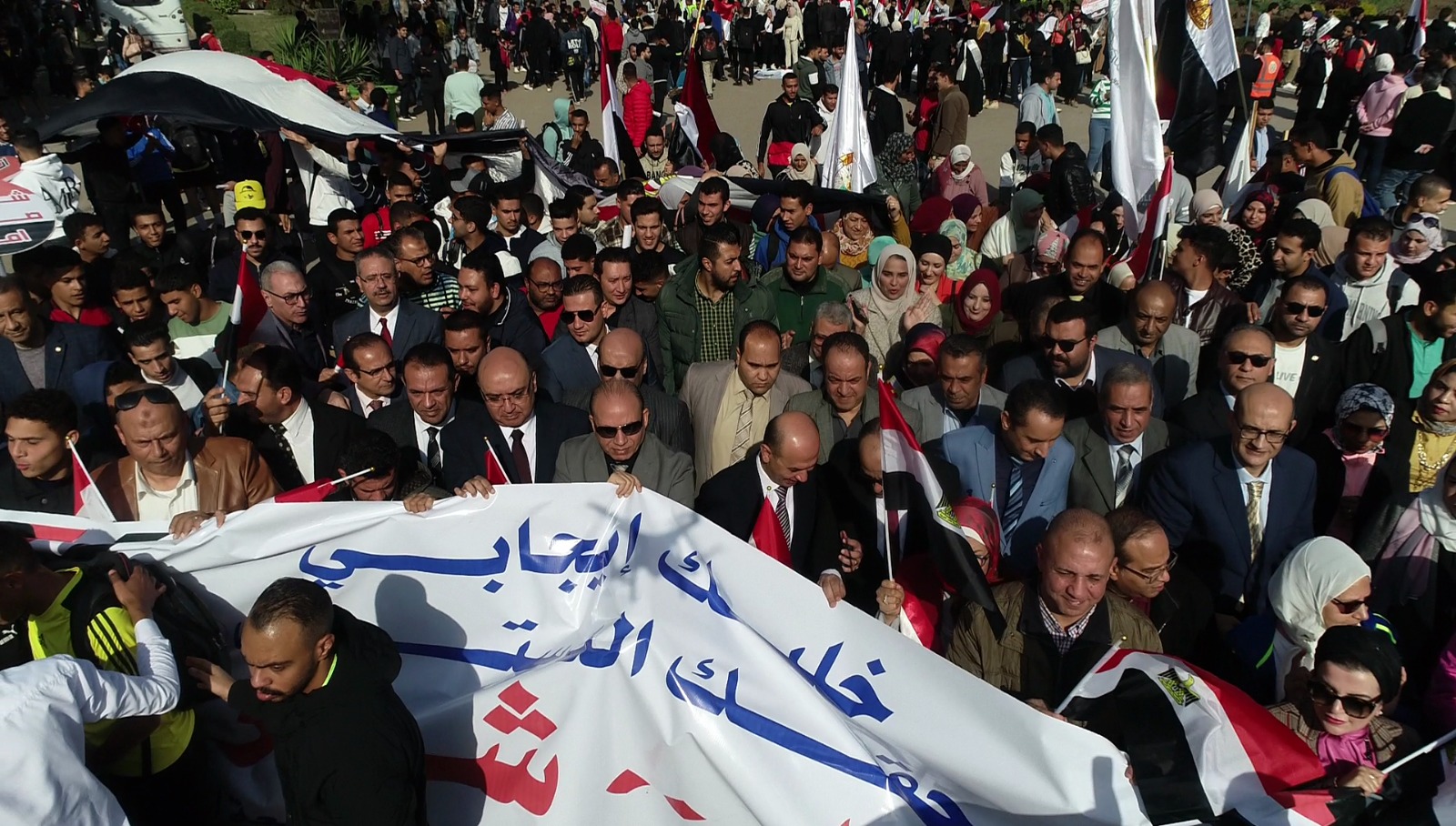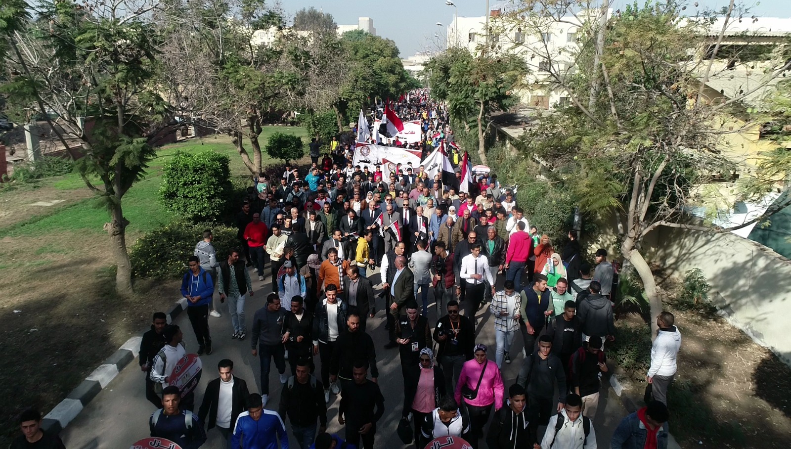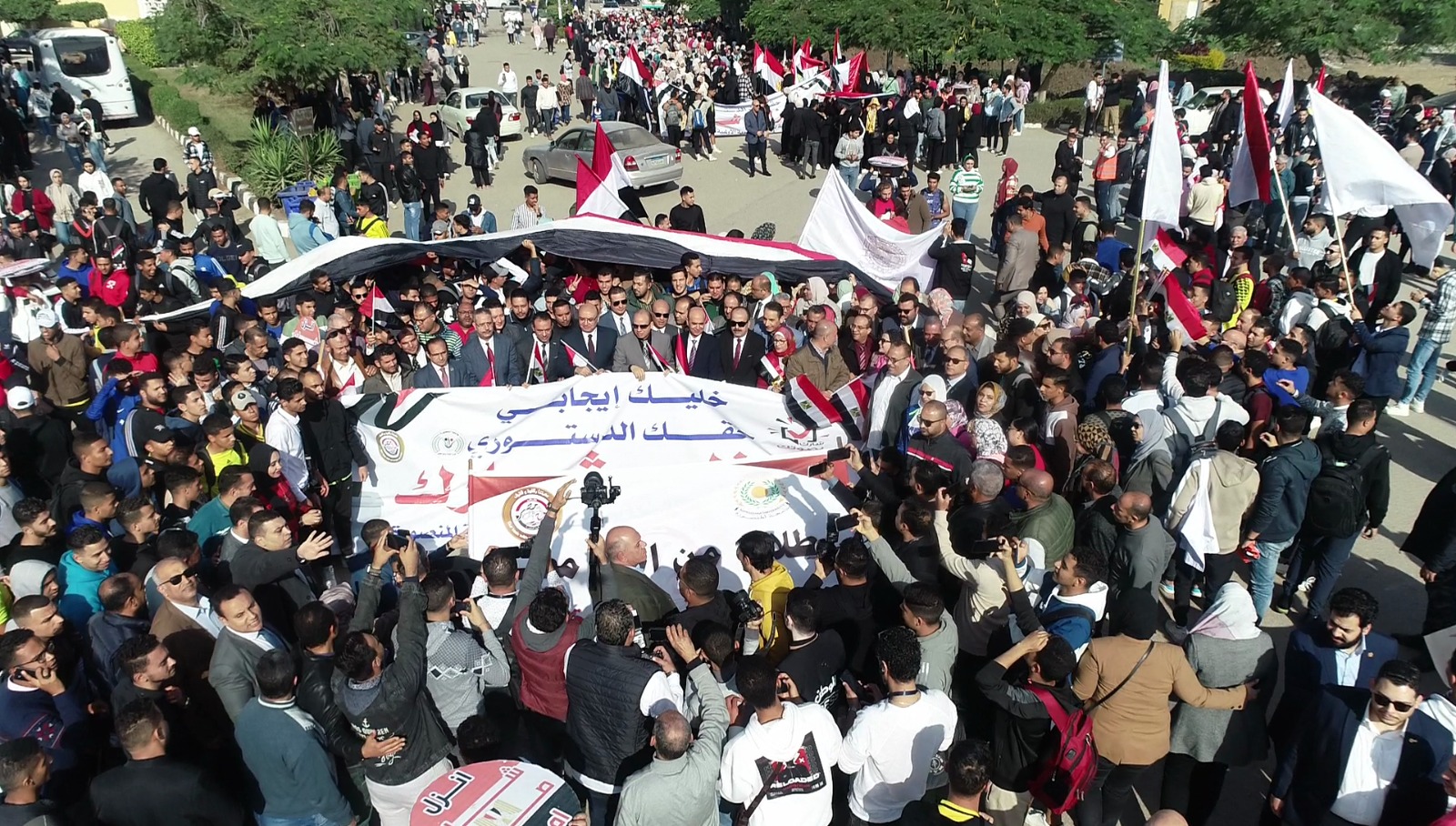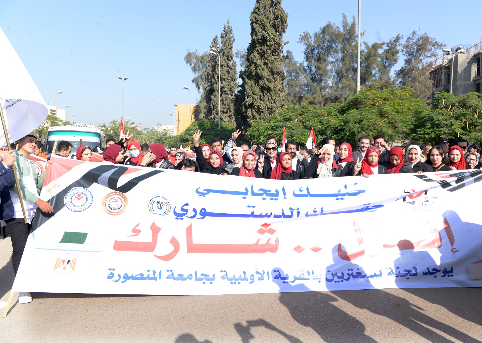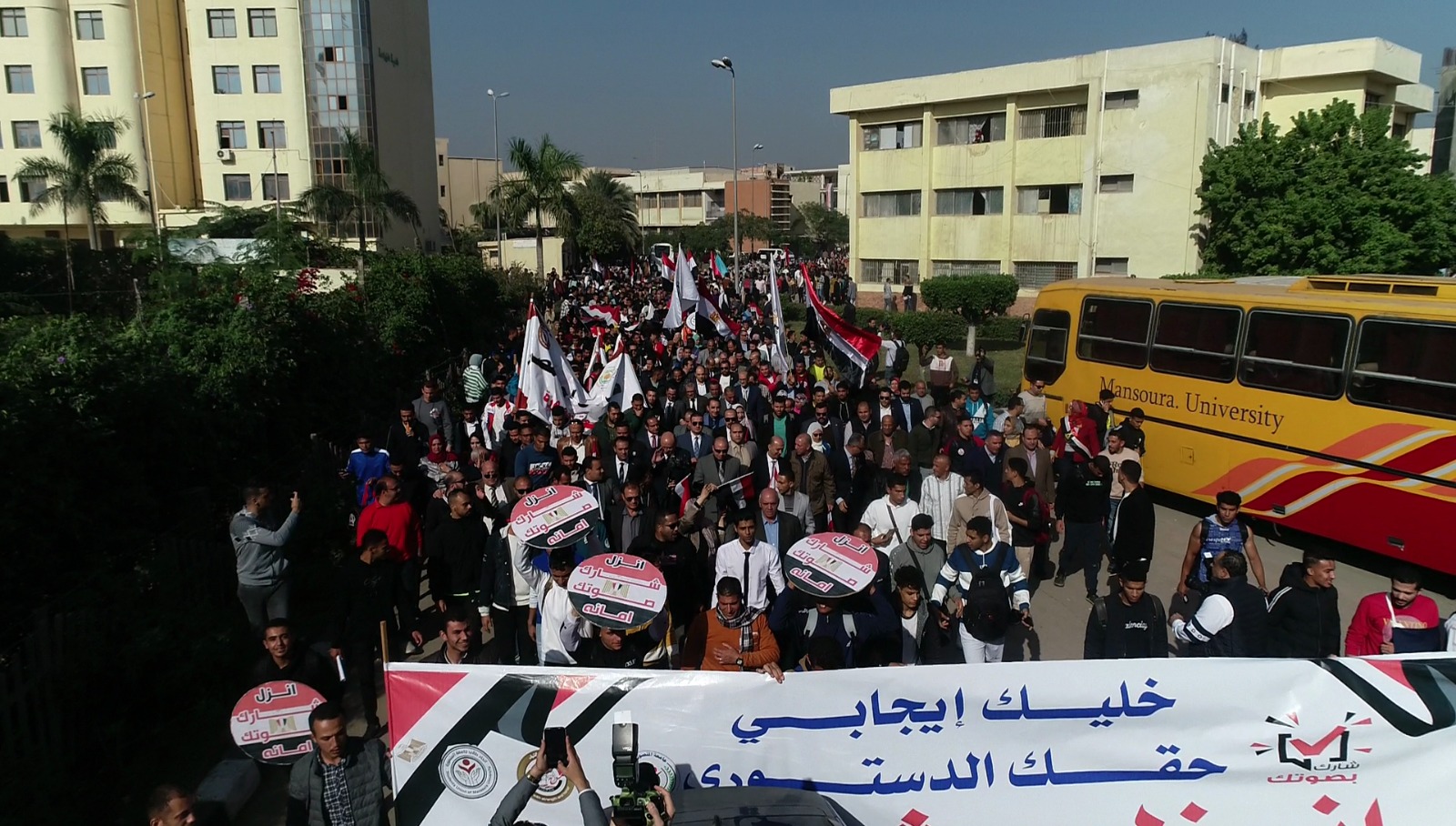 نظمت جامعة المنصورة في محافظة الدقهلية مسيرة حاشدة شارك فيها الآلاف من منسوبي جامعة المنصورة للحث على المشاركة الإيجابية في الانتخابات الرئاسية بعنوان " انزل شارك..صوتك هيوصل"