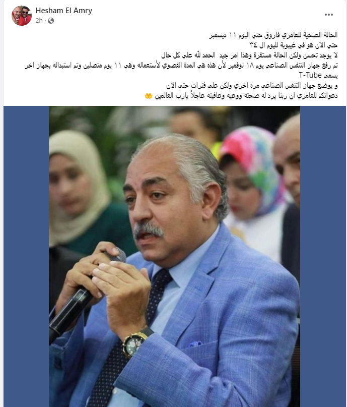 حالة العامري فاروق، نائب رئيس النادى الأهلى، كشفها شقيقه موضحًا أن حالته الصحية مستقرة، وتم رفع جهاز التنفس الصناعي عنه يوم 18 نوفمبر الماضي، وتم استبداله بجهاز آخر يسمي T-Tube، ويوضع جهاز التنفس الصناعي مرة أخري ولكن علي فترات.