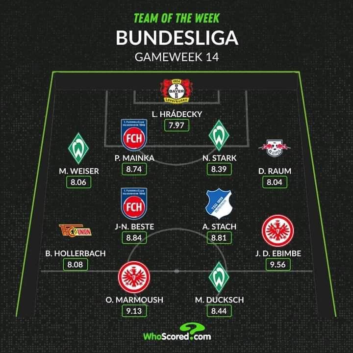 واستعرض موقع "هوسكورد" التشكيل المثالي للجولة الرابعة عشرة من الدوري الألماني، بتواجد النجم المصري عمر مرموش، بعد حصوله على ثانى أعلى تقييم فى التشكيل بقيمة 9.1 نقاط، خلف زميله فى الفريق إيريك إبيمبا بـ 9.6 نقاط.