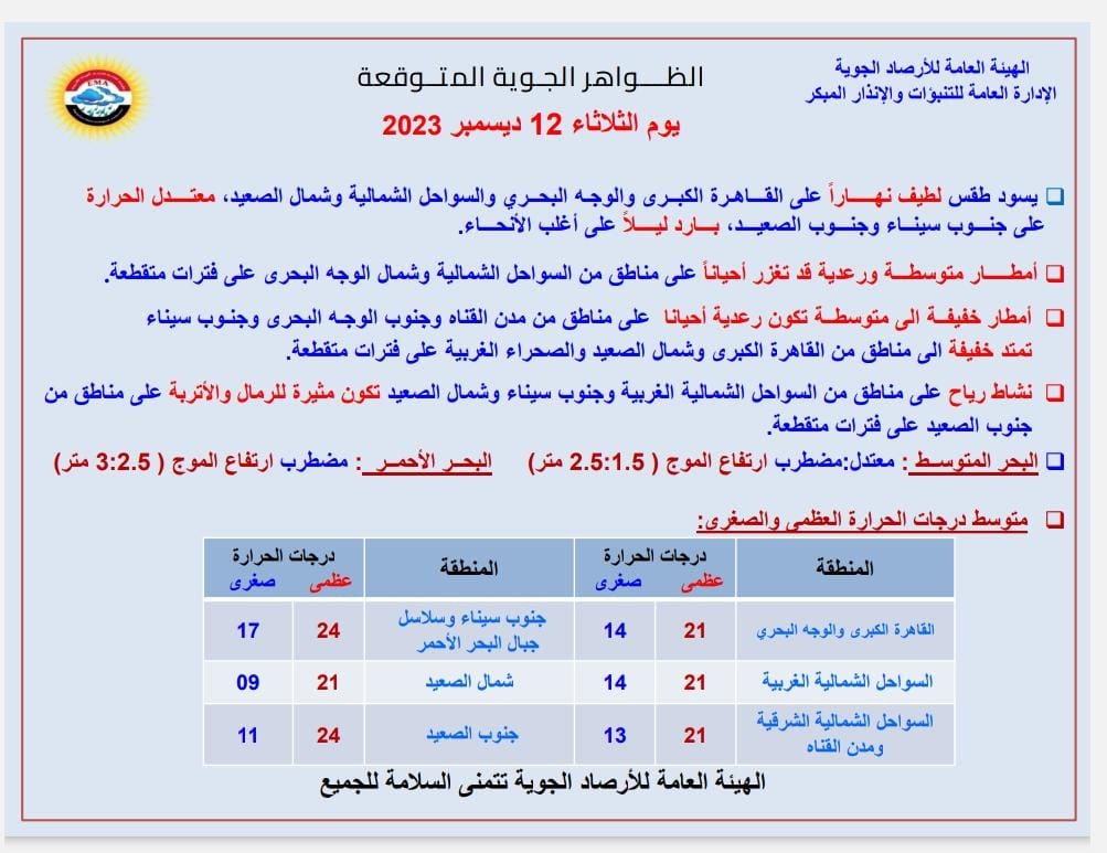 عن نشاط الرياح، أوضحت الهيئة أنه من المتوقع أن تشهد مناطق من السواحل الشمالية الغربية وجنوب سيناء وشمال الصعيد تكون مثيرة للرمال والأتربة على مناطق من جنوب الصعيد على فترات متقطعة.