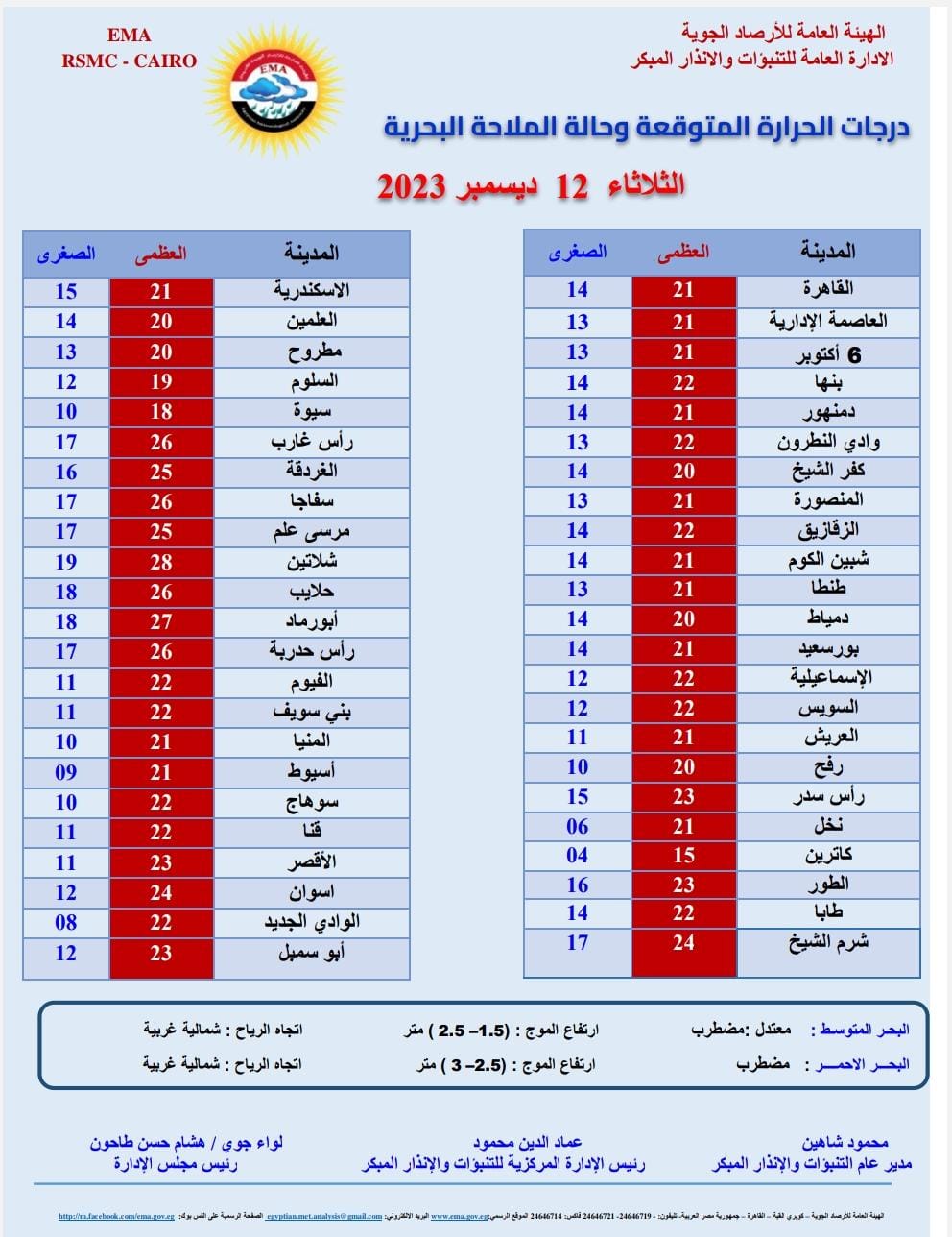 حالة الطقس، توقعت هيئة الأرصاد الجوية أن يسود طقس لطيف نهارًا على القاهرة الكبرى والوجه البحري والسواحل الشمالية وشمال الصعيد معتدل الحرارة على جنوب سيناء وجنوب الصعيد كما تظل الأجواء باردة ليلًا على أغلب الأنحاء.