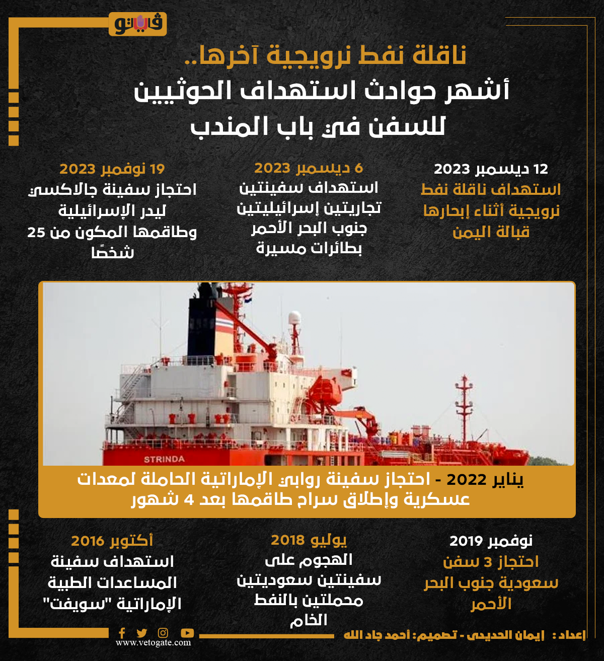 ناقلة نفط نرويجية آخرها.. أشهر حوادث استهداف الحوثيين للسفن في باب المندب (إنفوجراف) الثلاثاء 12/ديسمبر/2023 - 12:59 م 12/12/2023 12:59:39 PM السفينة التي هاجمها الحوثي بباب المندب، فيتو إيمان الحديدى شارك طباعة 18 حجم الخط شارك طباعة الإمارات إسرائيل اليمن جنوب البحر الأحمر جالاكسي ليدر باب المندب