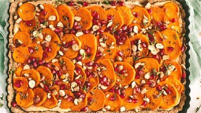 تقدم مزينة بحبات الرمان والصنوبر المحمص، وبالهنا والشفا.