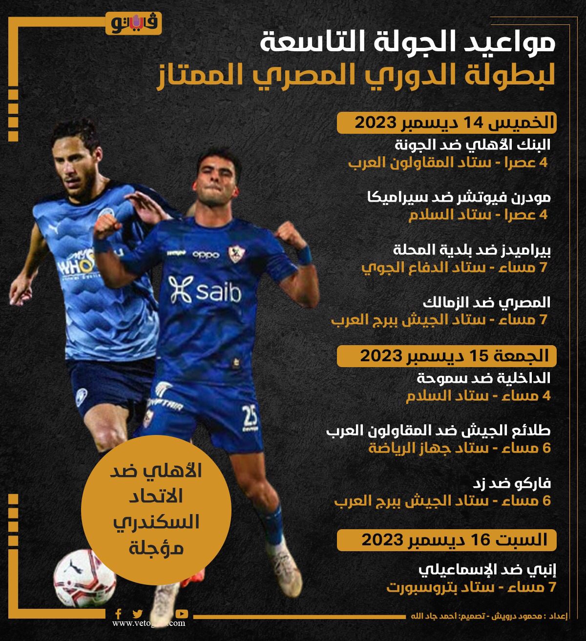 مواعيد الجولة التاسعة لبطولة الدوري المصري الممتاز (إنفوجراف) الأربعاء 13/ديسمبر/2023 - 10:40 ص 12/13/2023 10:40:20 AM مواعيد الجولة التاسعة لبطولة الدوري المصري الممتاز محمود درويش شارك طباعة 18 حجم الخط شارك طباعة الدوري المصري الدورى المصرى الممتاز إنبي ضد الإسماعيلي طلائع الجيش ضد المقاولون العرب المصري ضد الزمالك بيراميدز ضد بلدية المحلة