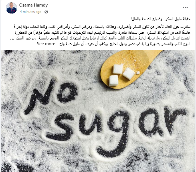 وأشار أسامة حمدي إلى أن "خفض استهلاك السكر في مصر، بالإضافة إلى إسهامه في الوقاية من الأمراض القاتلة، له عائد اقتصادي كبير؛ فمصر تستهلك سنويًّا نحو ٣,٢٥ مليون طن من السكر، وتنتج ٢,٧٥ مليون طن سنويًّا؛ لذلك تحتاج إلى استيراد ٥٠٠ ألف طن سنويًّا، فإذا خفَّضنا استهلاكنا من السكر إلى مجرد تحلية الشاي فقط (علشان الناس متزعلش) سينخفض استهلاكنا إلى أقل من ٥٠ جرامًا بكثير، فعشر ملاعق صغيرة من السكر تعادل ٤٠ جرامًا."