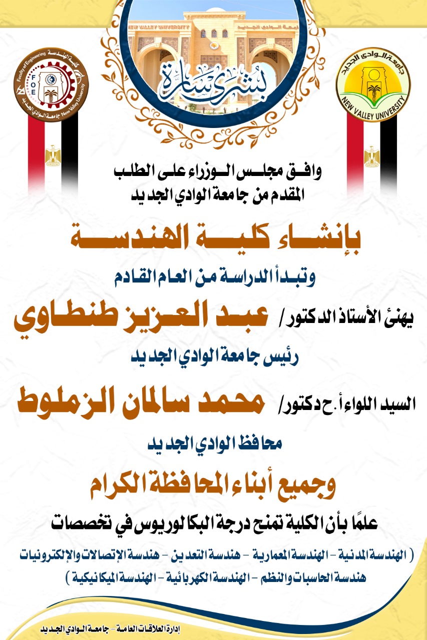 وتأتي هذه الخطوة في إطار رؤية الدولة التنموية لمحافظة الوادي الجديد، بهدف تكامل البرامج التعليمية بجامعة الوادي الجديد، واستهداف تخريج مهندسين متخصصين ذوي مهارات عالية وقادرين على استيعاب التكنولوجيا الحديثة في المجالات الهندسية، بالإضافة إلى تخفيف عبء الاغتراب عن أبناء المحافظة.