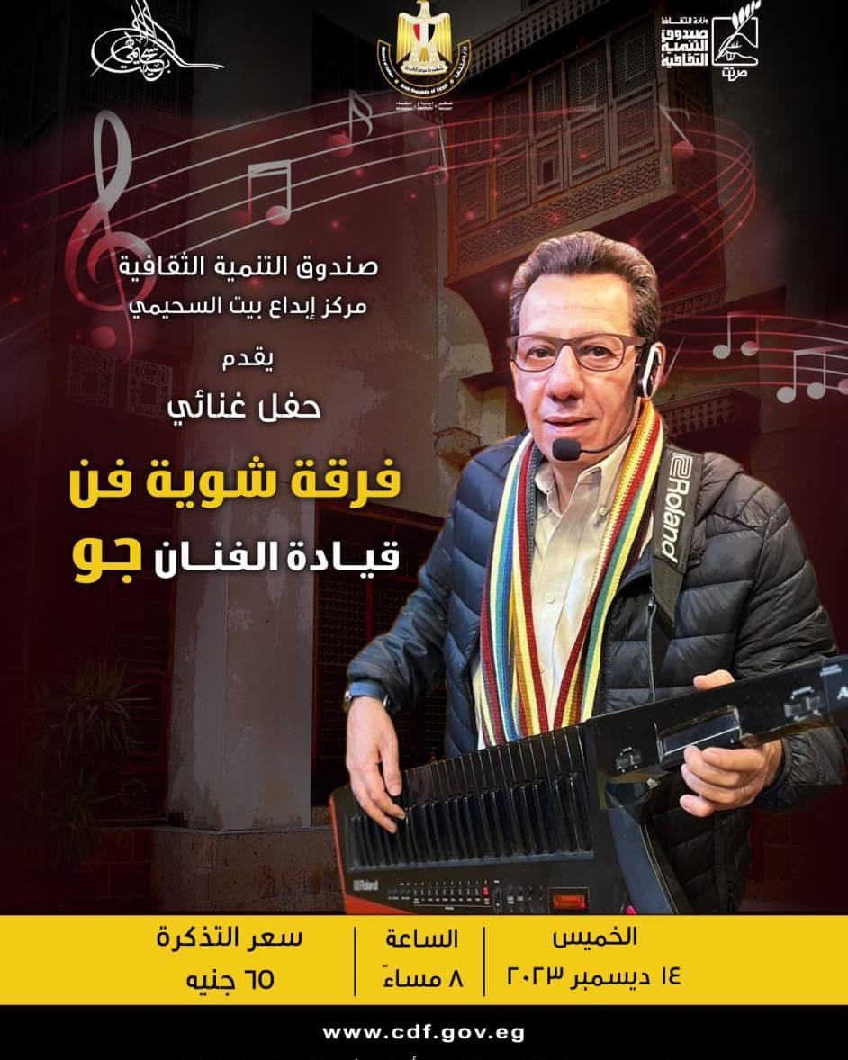 يقيم بيت السحيمي بشارع المعز، والتابع لقطاع صندوق التنمية الثقافية برئاسة الدكتور وليد قانوش، في السابعة من مساء غد الخميس الموافق 14 ديسمبر الجاري، حفلا غنائيا لفرقة "شوية فن" بقيادة الفنان أيمن جوزيف المشهور ب"جو".