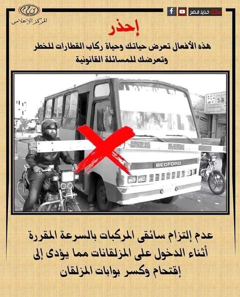 ناشدت وزارة النقل المواطنين بالمشاركة في حملات التوعية للحفاظ على سلامة مرفق السكة الحديد، وذلك من خلال القيام بحملة توعية عبر صفحتها الرسمية على موقع التواصل الاجتماعي فيسبوك للقضاء على بعض السلوكيات التي تعرض حياة الركاب وسائقي القطارات للخطر.