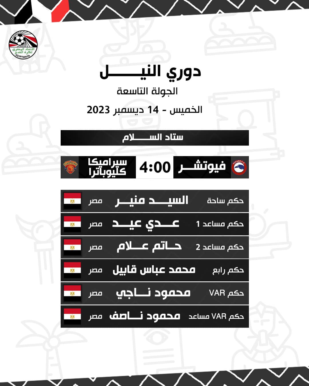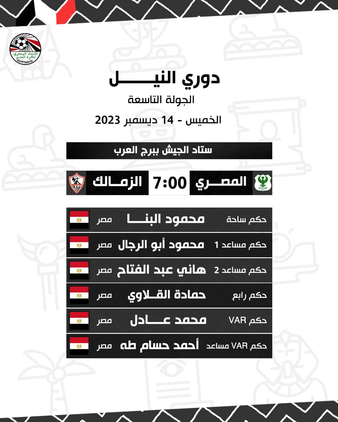 أعلنت لجنة الحكام الرئيسية باتحاد الكرة المصري، أسماء حكام مباريات اليوم الخميس، في افتتاح مباريات الجولة التاسعة من من مسابقة الدوري الممتاز.