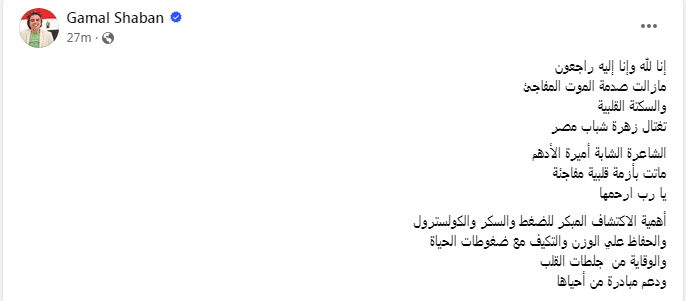 وقال الدكتور جمال شعبان عن وفاة أميرة الأدهم: "ماتت بأزمة قلبية مفاجئة.. يا رب أرحمها.. أهمية الاكتشاف المبكر للضغط والسكر والكولسترول والحفاظ علي الوزن والتكيف مع ضغوطات الحياة والوقاية من جلطات القلب ودعم مبادرة من أحياها"