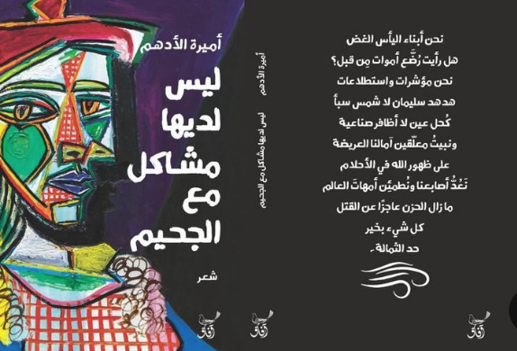 كما أن الشاعرة أميرة الأدهم طبيبة نفسية، تتعامل بمشرط جراح يكشف أغوار النفس، فتعيد قراءة العالم ومسألة ذاكرتنا المتخمة بالجراح والهزائم، ما دفعها لكتابة قصيدة "وراء قلوبهم" التي تقول فيها: "وراء قلوبهم.. عرفتُ أنهم يخبئون ولاعاتهم وراء قلوبهم.. وينسونها على أبواب العلاقات غير المكتملة.. خرجتُ إلى نور شارد صاخب جعلني الاتهام في مواجهة حلمي كعاملِ إطفاء مرة.. وضابط في الجيش النازي يشهد على المحرقة مرة.. كنتُ إنسانيا وخائفا.. كان أصدقائي يشبهون الشحاذين.. لم أكن أدري أنني سأعود لوصف الخروج من المنزل والتصدي لحنين الأغاني العاطفية.. حين خبأوا ولاعاتهم وراء قلوبهم.. أمام سجائري ولاعات مشتعلة كنتُ أدخن بشراهة".