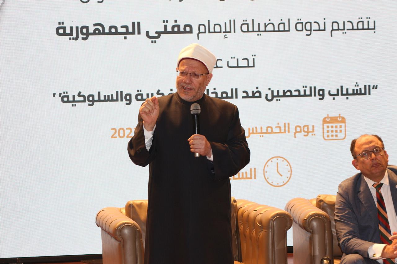 وشدَّد على ضرورة انتباه الشباب لمخاطر التكنولوجيا الحديثة والتحقق من المعلومات التي يتلقونها من خلال وسائل التواصل الاجتماعي باللجوء إلى المتخصصين والمصادر الرسمية المعتمدة للتثبت من المعلومات، مؤكدًا أن التخصص واللجوء إليه من واجبات الإسلام، وأن دار الإفتاء المصرية تستعين بالمتخصصين في كافة المجالات المختلفة الطبية والاقتصادية والعلمية وغيرها، واستفادت كثيرًا من علماء الطب خلال جائحة كورونا، ناصحًا للطلاب: "لا تدخل المعلومات إلى عقلك دون تثبت أو فلترة، واحذر من خطر نشر المعلومات أو إعادة نشرها دون تثبت".