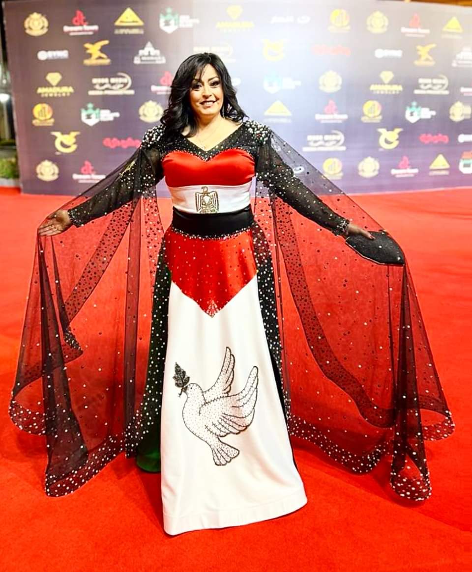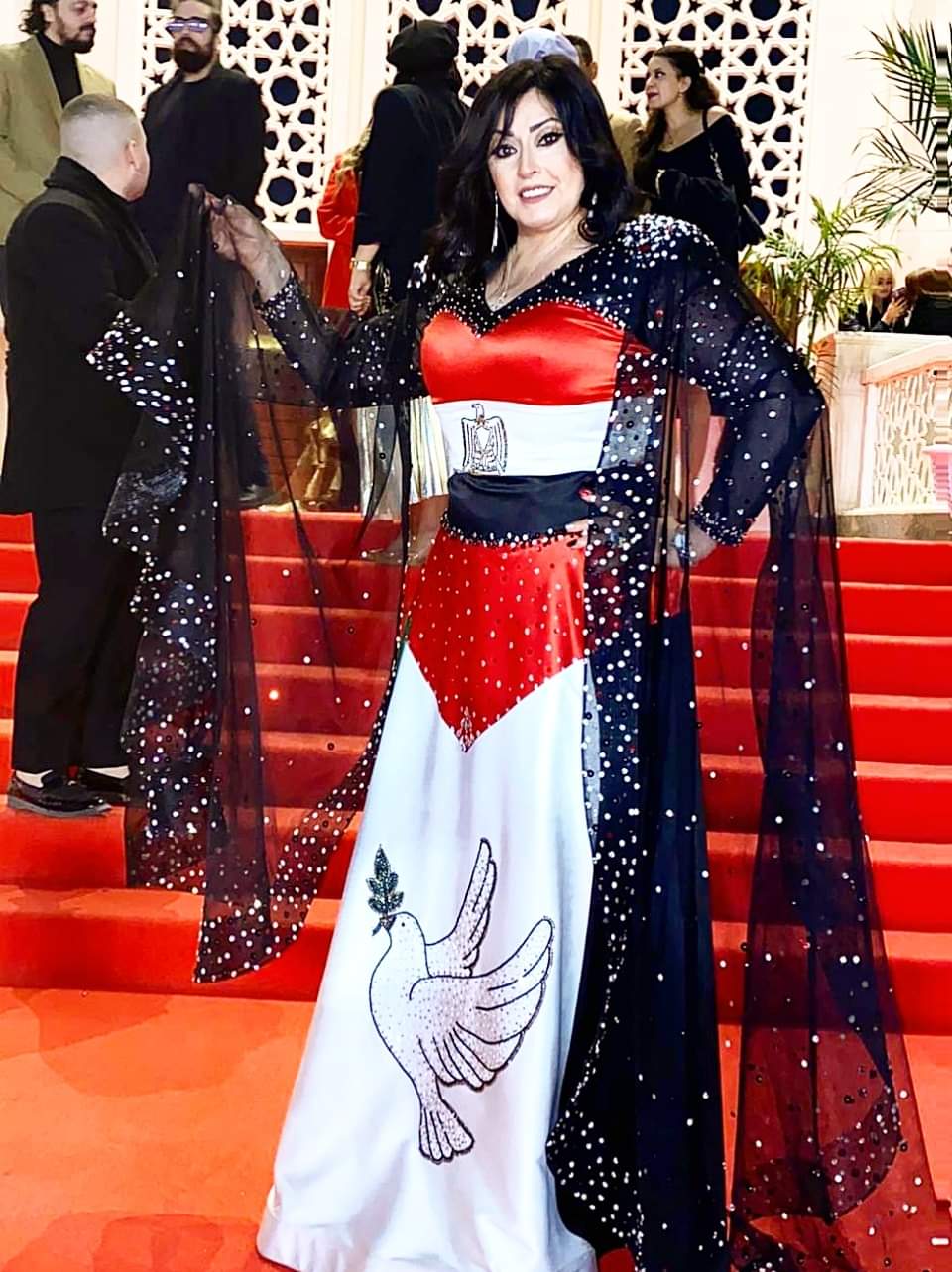 وعن تحليل الفستان أكدت: "الأكمام تعني حمامة السلام وهناك حمامة سلام أسفل الفستان وعلم مصر بيدعم علم فلسطين".