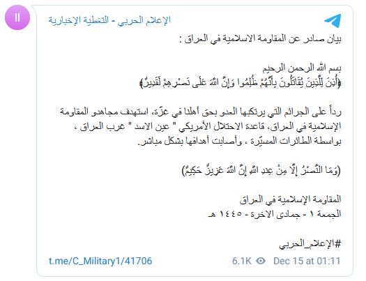 وقالت "المقاومة الإسلامية في العراق" في بيان "ردا على الجرائم التي يرتكبها العدو بحق أهلنا في غزة، استهدف مجاهدو المقاومة قاعدة الاحتلال الأمريكي "عين الأسد" غرب العراق بواسطة الطائرات المسيرة".