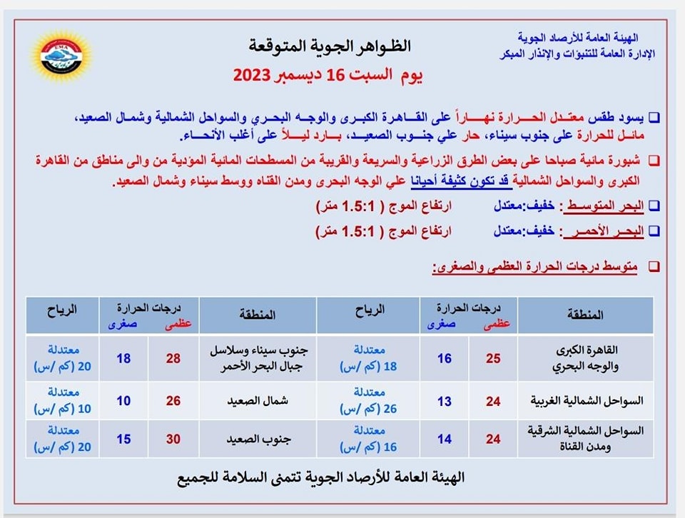 حالة الطقس اليوم، أعلنت هيئة الأرصاد الجوية حالة الطقس المتوقعة اليوم السبت 16- 12- 2023، محذرة من شبورة مائية كثيفة صباحًا.