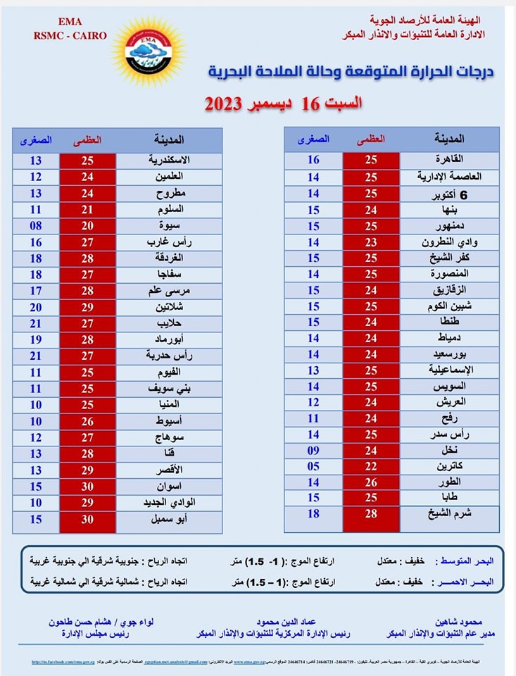 ونشرت هيئة الأرصاد الجوية بيانا بدرجات الحرارة المتوقعة اليوم السبت والتي جاءت كالتالي: