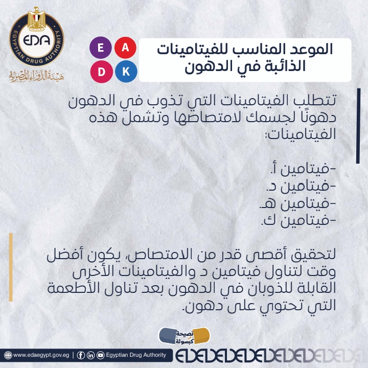 وأكدت هيئة الدواء المصرية أن الفيتامينات الذائبة في الدهون مع الطعام وتشمل هذه الفيتامينات " فيتامين أ، ك، ه، د "